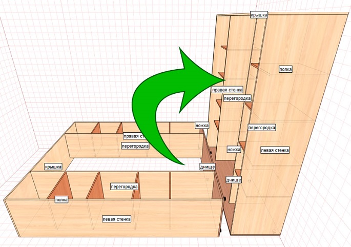 Порядок сборки углового шкафа практически ничем не отличается от описанного выше. С той лишь разницей, что корпус будет состоять из двух составных частей, которые необходимо будет соединить под углом 90º по отношению друг к другу. Причём целесообразнее сначала собрать их по отдельности (хотя бы основные стороны), а затем прикрепить друг к другу. Между основным модулем и «угловой частью» шкафа должно быть не менее 3 точек крепления.
