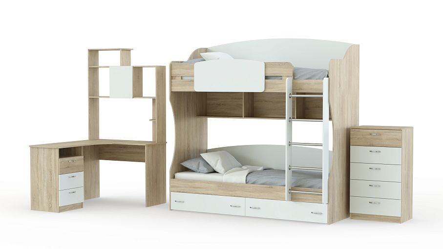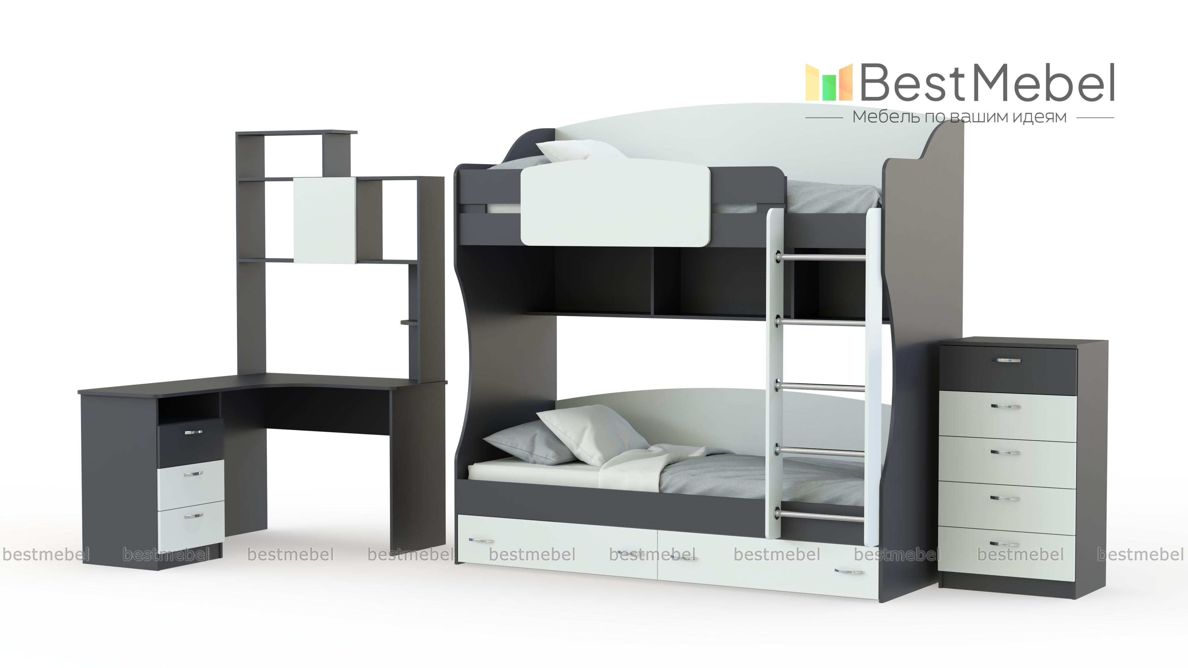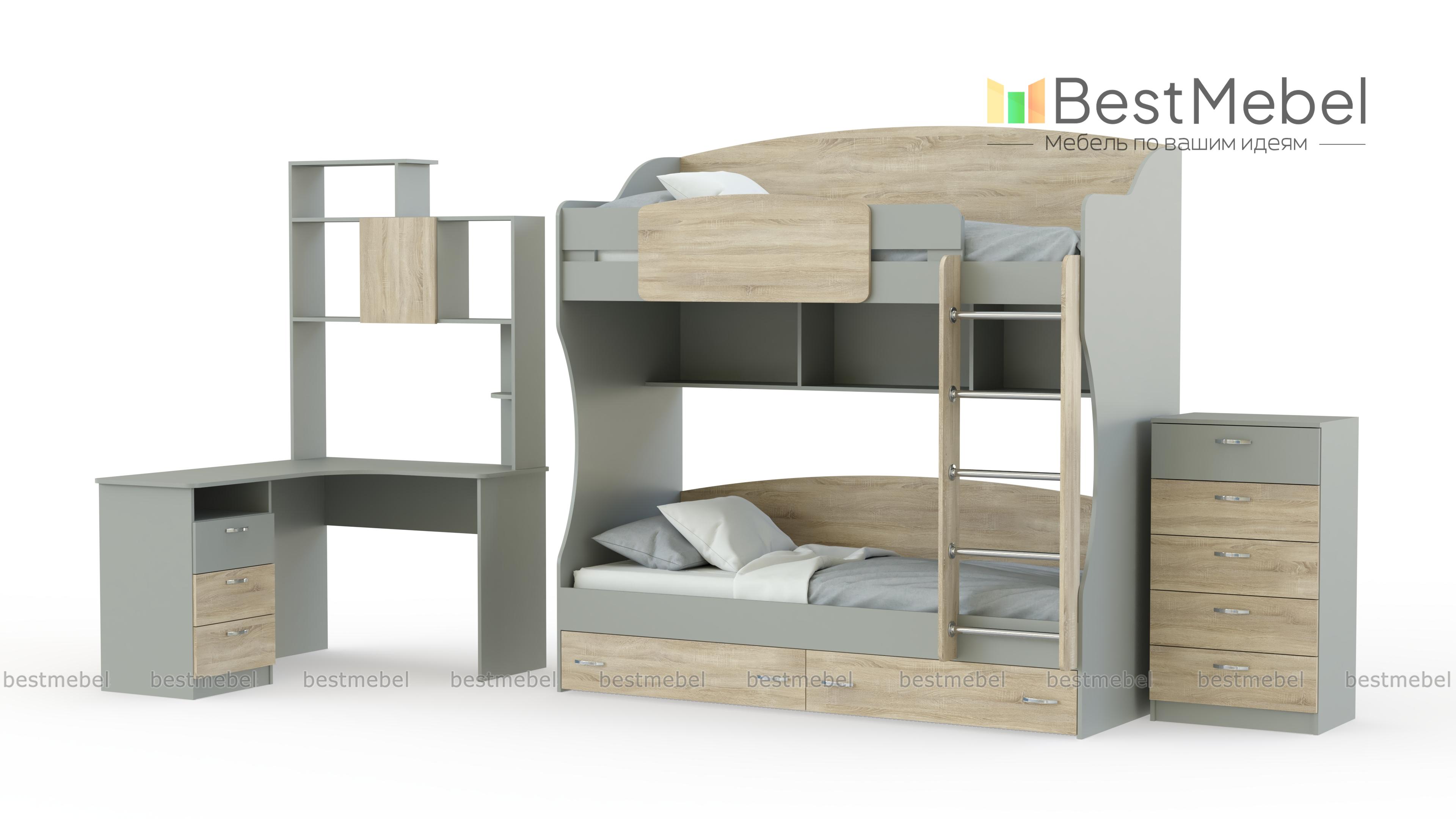 Детская Вояж BMS – простое и функциональное решение для комнаты двоих детей. Практичная конструкция из отдельных модулей легко впишется в любую планировку, а универсальное цветовое решение подойдет и мальчикам, и девочкам. Угловой компьютерный стол с тумбой и надстройкой сэкономит полезную площадь, а двухъярусная кровать – это не только полноценные спальные места, но и дополнительные полки и ящики для хранения. Предметы гардероба и аксессуары смогут разместиться в пяти выдвижных ящиках комода. Купить детскую Вояж BMS по лучшей цене приглашаем к нам в интернет-магазин.