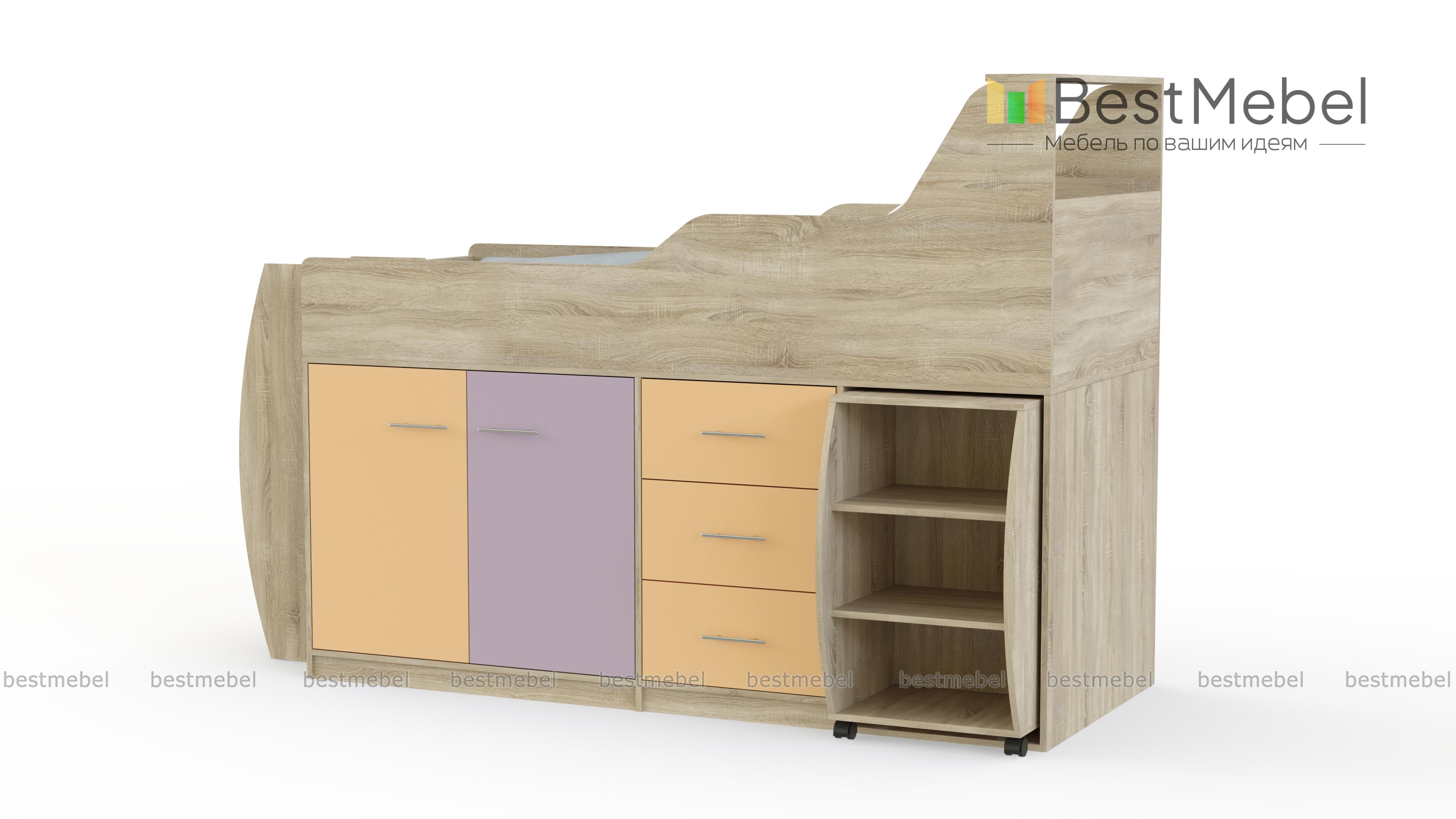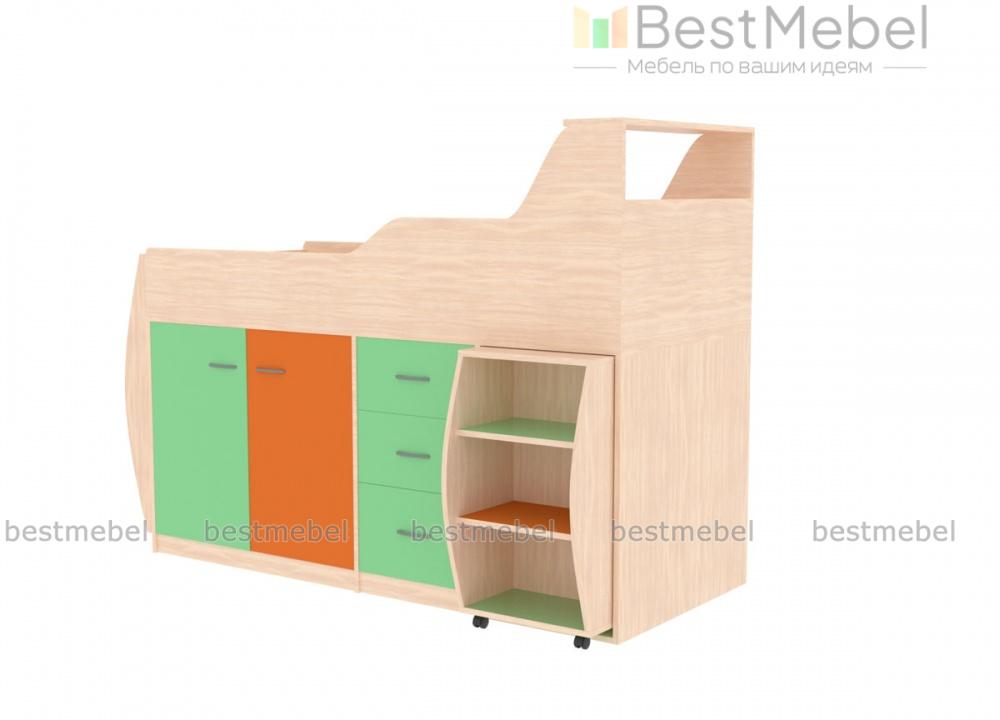 Кровать-чердак Минимакс BMS представляет собой мебельный комплекс, объединивший зону отдыха с удобной системой хранения и местом для творческих занятий. Незаменимая в малогабаритных квартирах, композиция включает в себя просторное спальное место с полкой в изголовье и защитными бортиками, устойчивую лестницу и расположенные на первом ярусе выдвижные ящики, распашное отделение и выкатной столик с мини-стеллажом. Яркий дизайн порадует ребенка и создаст в помещении комфортную атмосферу. Купить кровать-чердак Минимакс BMS приглашаем в наш интернет-магазин.