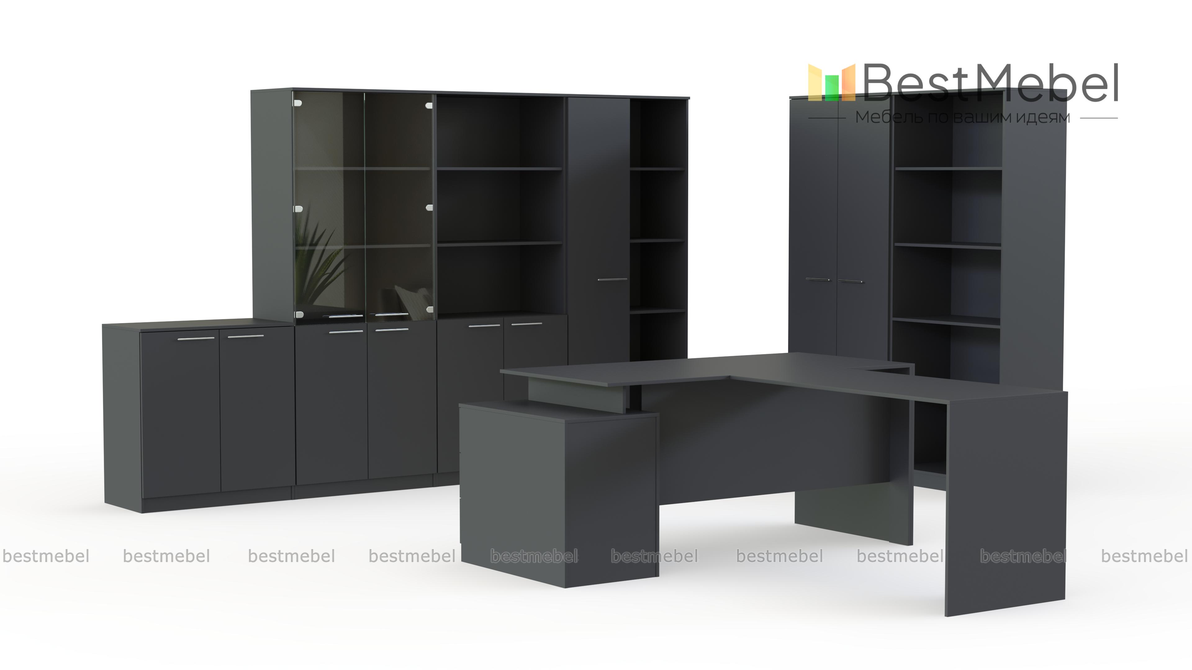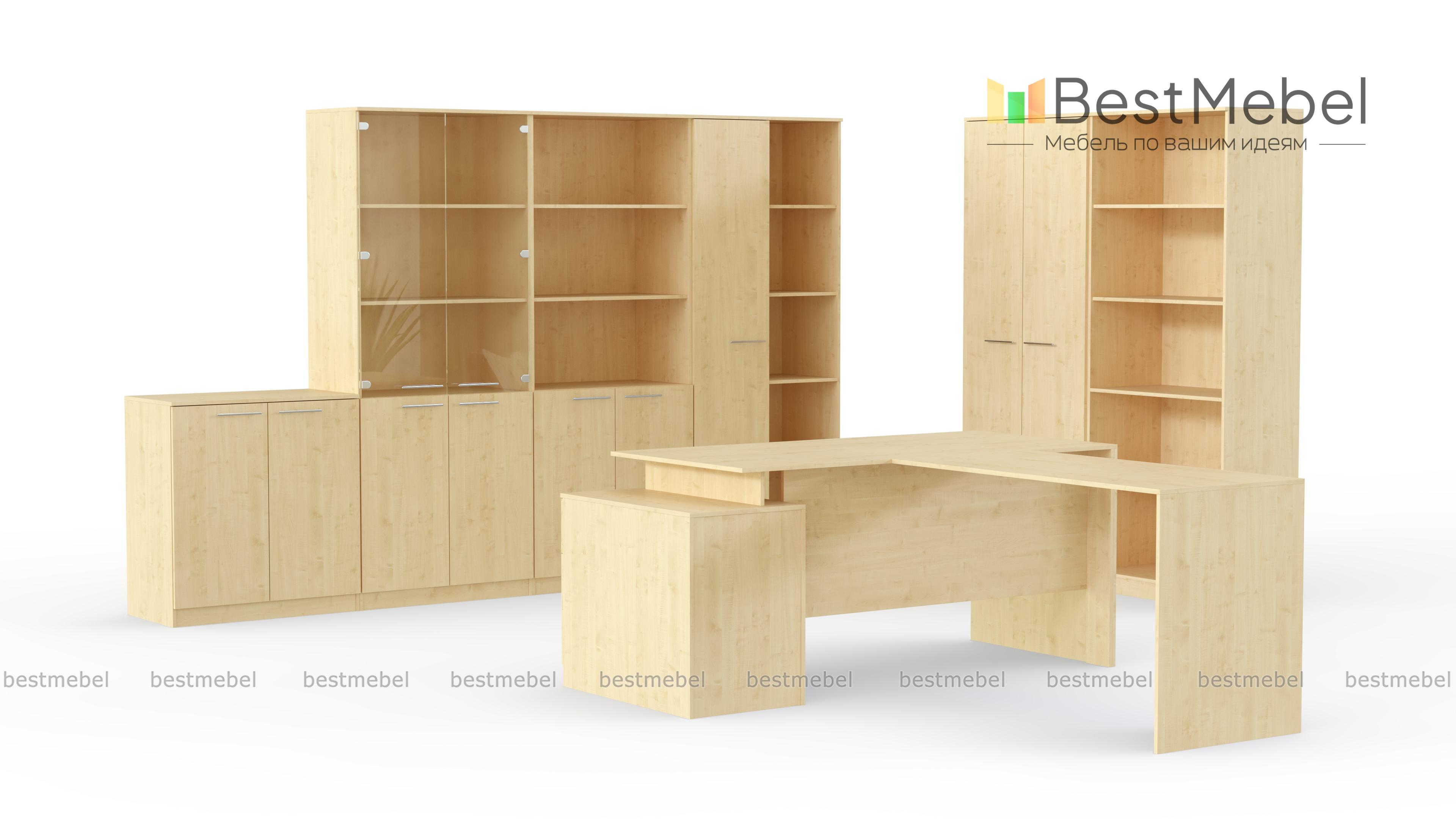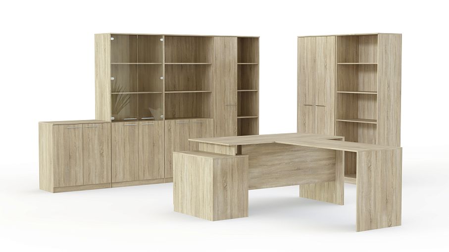 Комплект мебели для просторного кабинета в классическом стиле. Ничего лишнего, только лаконичные формы и строгие линии. Максимум комфорта и практичности по доступной цене. В конструкции мебели предусмотрены места для хранения документов, открытие и закрытые полки и шкаф для личных вещей. В комплект также входит просторный стол, непосредственно для руководителя и посетителей.