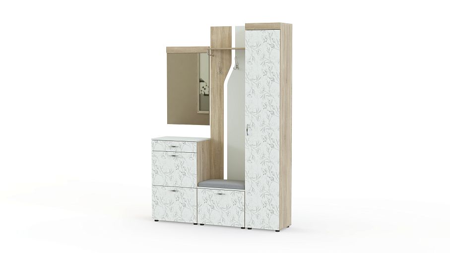 Мэри 4 BMS – модульная прихожая, которая станет изящным дополнением уютного классического интерьера. Отдельные элементы вы сможете расположить по своему вкусу, подчеркнув все достоинства планировки. Особенно привлекательный вид модели придает декоративное оформление фасадов горизонтальным орнаментом. В комплекте пенал для одежды с полками, открытая вешалка, обувница с мягким сиденьем в ткани, высокая тумба и зеркало. Купить прихожую Мэри 4 BMS по лучшей цене приглашаем в наш интернет-магазин.