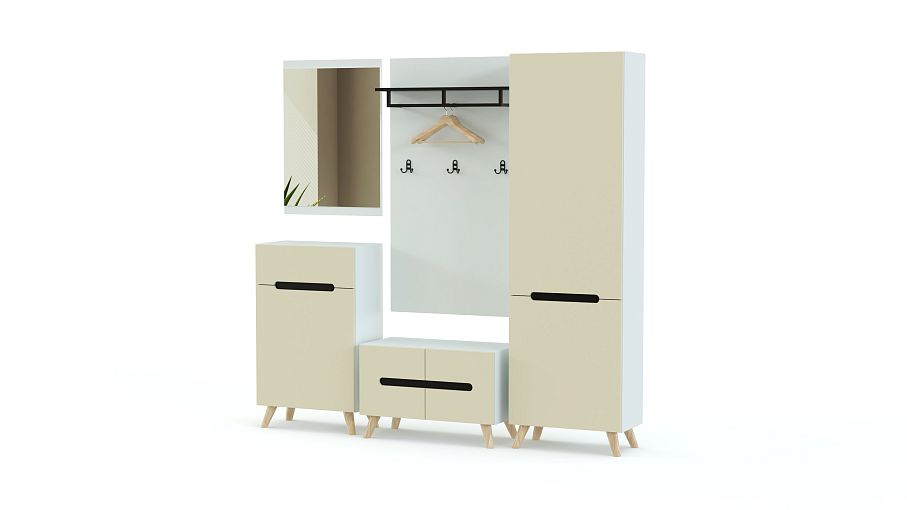Прихожая Лили 16.2 BMS с фасадами в универсальных светлых тонах поможет оформить входную зону в эстетике минимализма. Пенал, распашная тумба для обуви, комод, навесное зеркало и оснащенная полкой под головные уборы, крючками и штангой вешалка гармонично сочетаются друг с другом. Округлые ручки-вырезы с контрастными вставками оживляют композицию, а высокие скошенные ножки добавят интерьеру легкости. Купить прихожую Лили 16.2 BMS вы сможете в нашем интернет-магазине, по желанию изменив цвет и размеры.