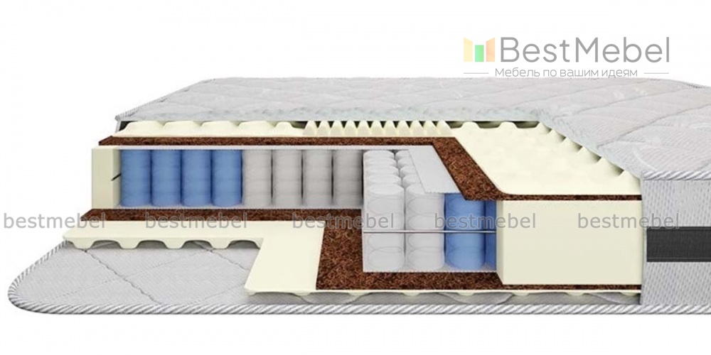Матрас Ника – прекрасное спальное место со средней жёсткостью. Он выполнен из разработанных для матрасной промышленности наполнителей – кокосовой койры, спандбонда, латекса, ортопены. Здесь же присутствует 3D сетка, пропускающая воздух. Блок пружин имеет усиленные точки из более жёстких пружинных элементов. Они находятся под самыми тяжёлыми участками человека. За счёт этого, матрас принимает анатомическую форму спящего и прекрасно поддерживает позвоночник, позволяя организму расслабиться и отдохнуть. Матрас Ника сделает утро счастливым! Купить матрас Ника в нашем мебельном магазине можно по низкой цене.