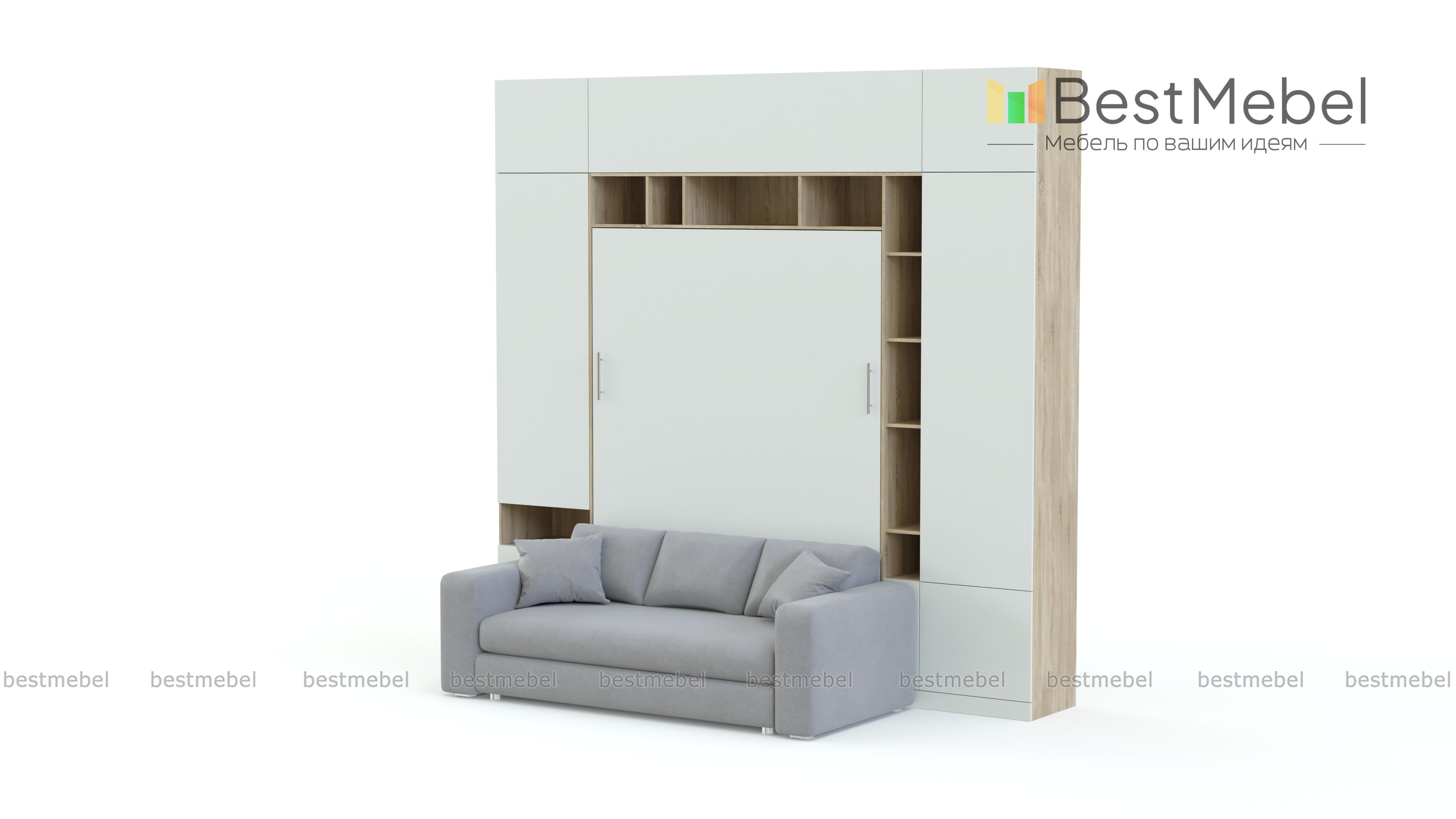 Шкаф-кровать Тида 06 BMS по достоинству оценят владельцы малогабаритных квартир и студий. Создать функциональный, визуально легкий и светлый интерьер в стиле минимализм поможет вам композиция 3 в 1. Стенка с белоснежным глухим фасадом, дополненным цветными вставками открытых полок, оборудована удобной системой хранения и модулем с откидной кроватью, а комфортный отдых подарит уютный мини-диван. Полноценное спальное место вы получаете при помощи надежного вертикального механизма. Купить шкаф-кровать Тида 06 BMS приглашаем в наш интернет-магазин.
