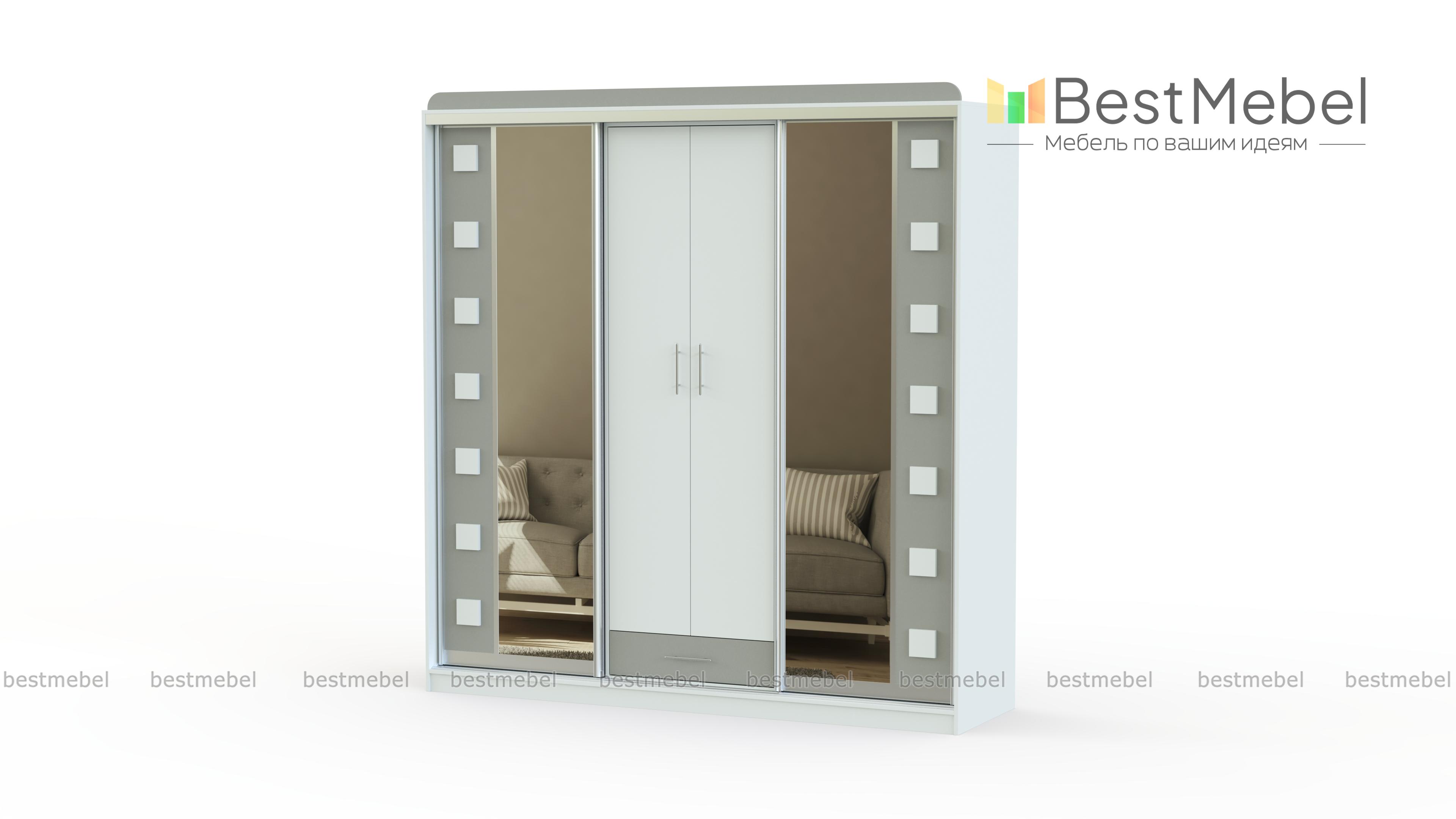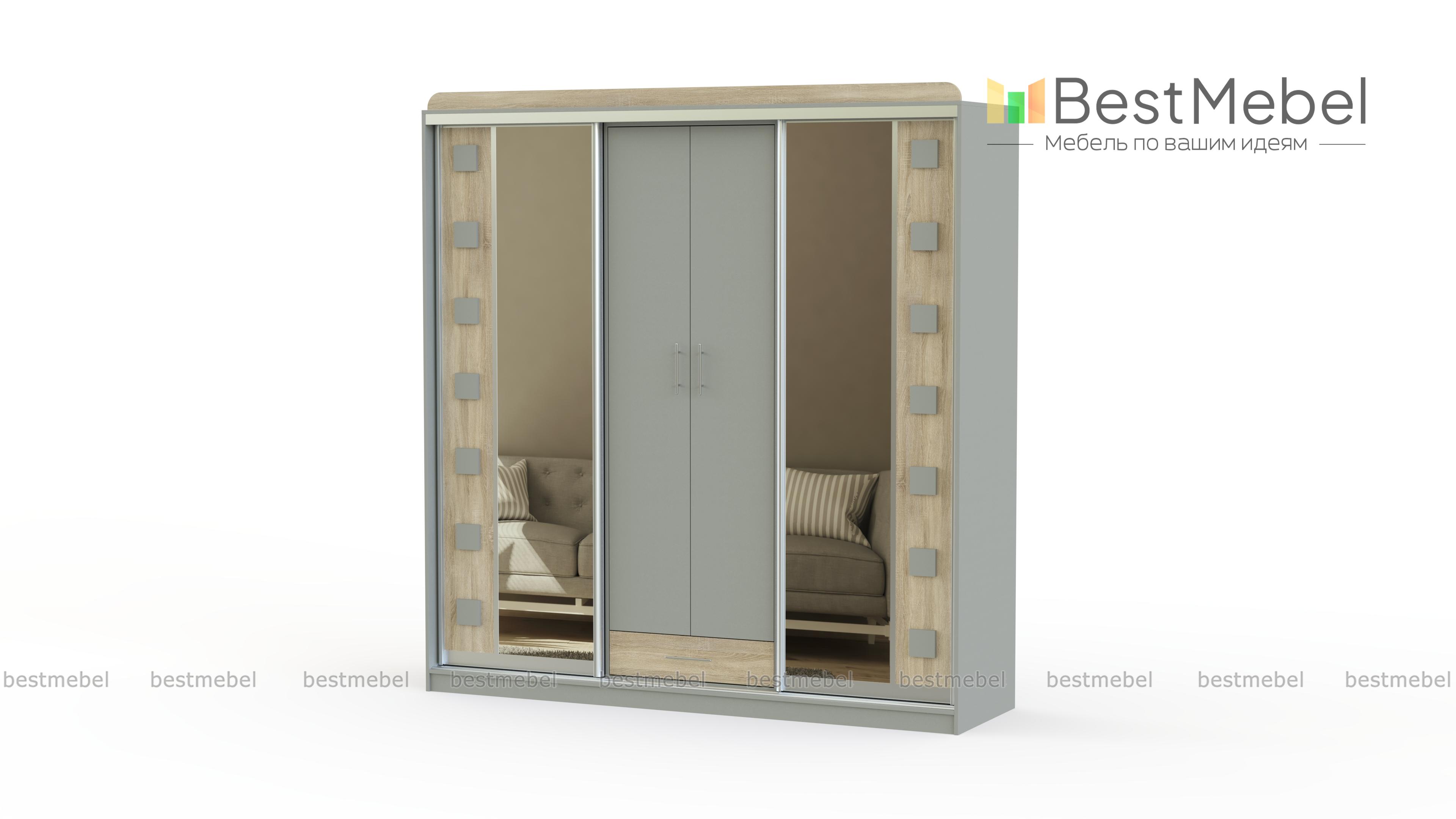 Шкаф-купе София BMS имеет комбинированную конструкцию, которая обеспечивает разные варианты хранения. Двухдверная распашная секция в центре дополнена выдвижным ящиком для мелочей и боковыми отделениями с раздвижными створками. В отделке фасадов шкафа использованы ламинированная плита темного оттенка, зеркала и квадратные декоративные вставки. Купить шкаф-купе София BMS вы сможете в нашем интернет-магазине с выбором размеров, цвета и компоновки.