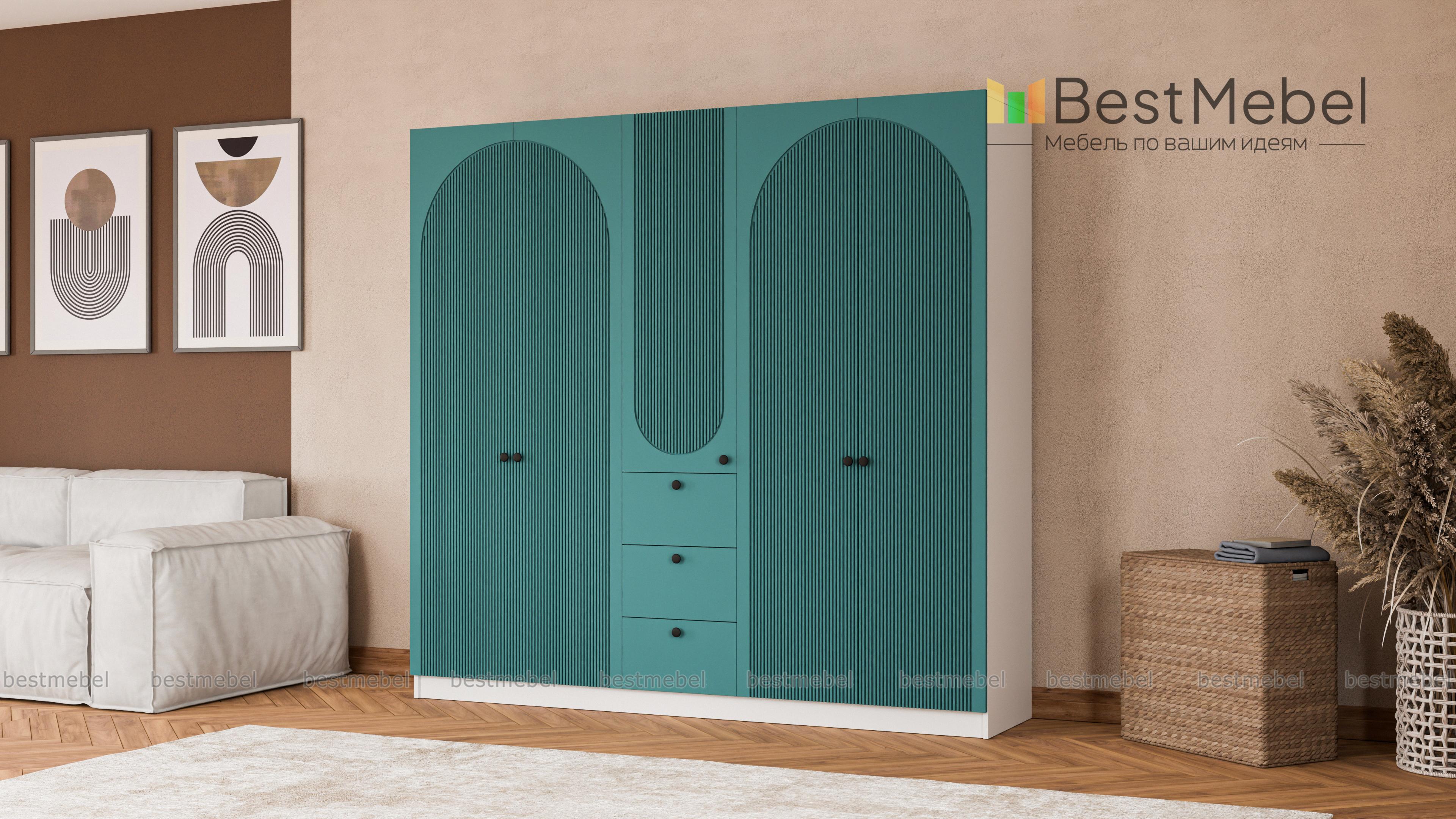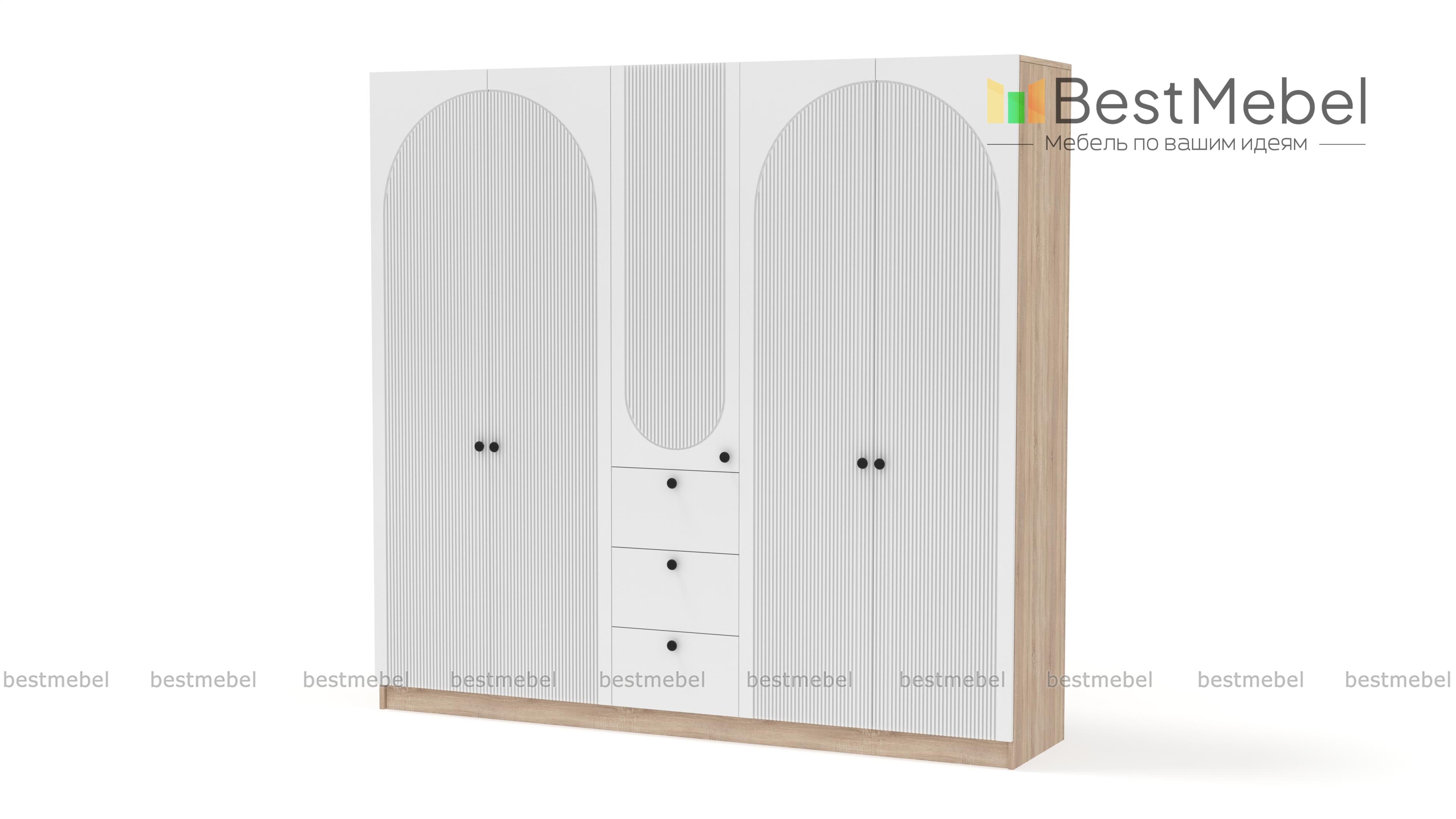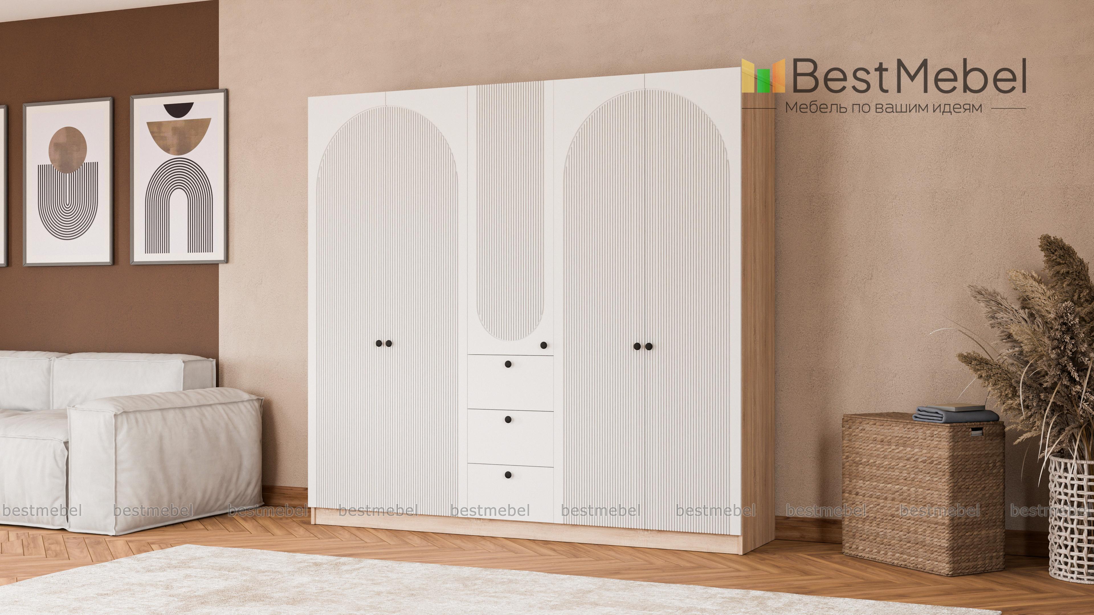 Шкаф распашной Вивьен 15 BMS — удобный и стильный, найдет себе место в спальне и прихожей. Двухдверные секции для одежды разделены комбинированным пеналом с бельевыми полками и тремя ящиками. Корпус и фасад шкафа выполнены в комфортных теплых тонах из материалов высокого качества, дверцы украшает броский геометричный рельеф. Купить шкаф распашной Вивьен 15 BMS с индивидуальным подбором размеров, цвета и компоновки вы всегда сможете на сайте нашего интернет-магазина.