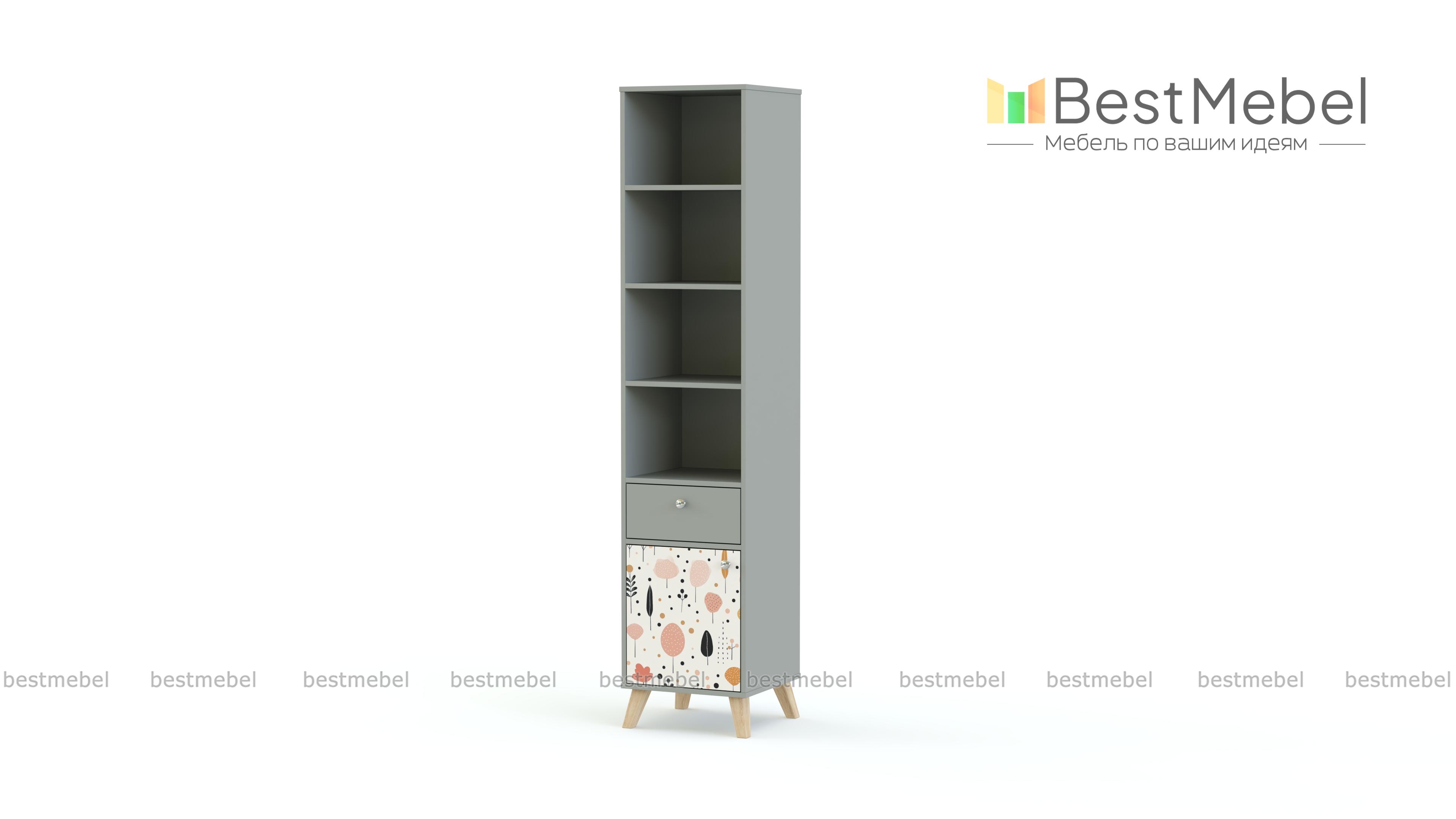 Стеллаж Эльза 5 BMS поможет в обустройстве рабочей или игровой зоны в детской. Модель со скошенными деревянными ножками оборудована тремя полками для книг и игрушек, выдвижным ящиком для мелочей и нижним отделением с распашной дверцей. Для отделки корпуса и фасада выбраны нейтральные светлые оттенки, эргономичная фурнитура и стильный рисунок-фотопечать. Купить стеллаж Эльза 5 BMS, изготовленный по вашим размерам, вы сможете на сайте нашего интернет-магазина.