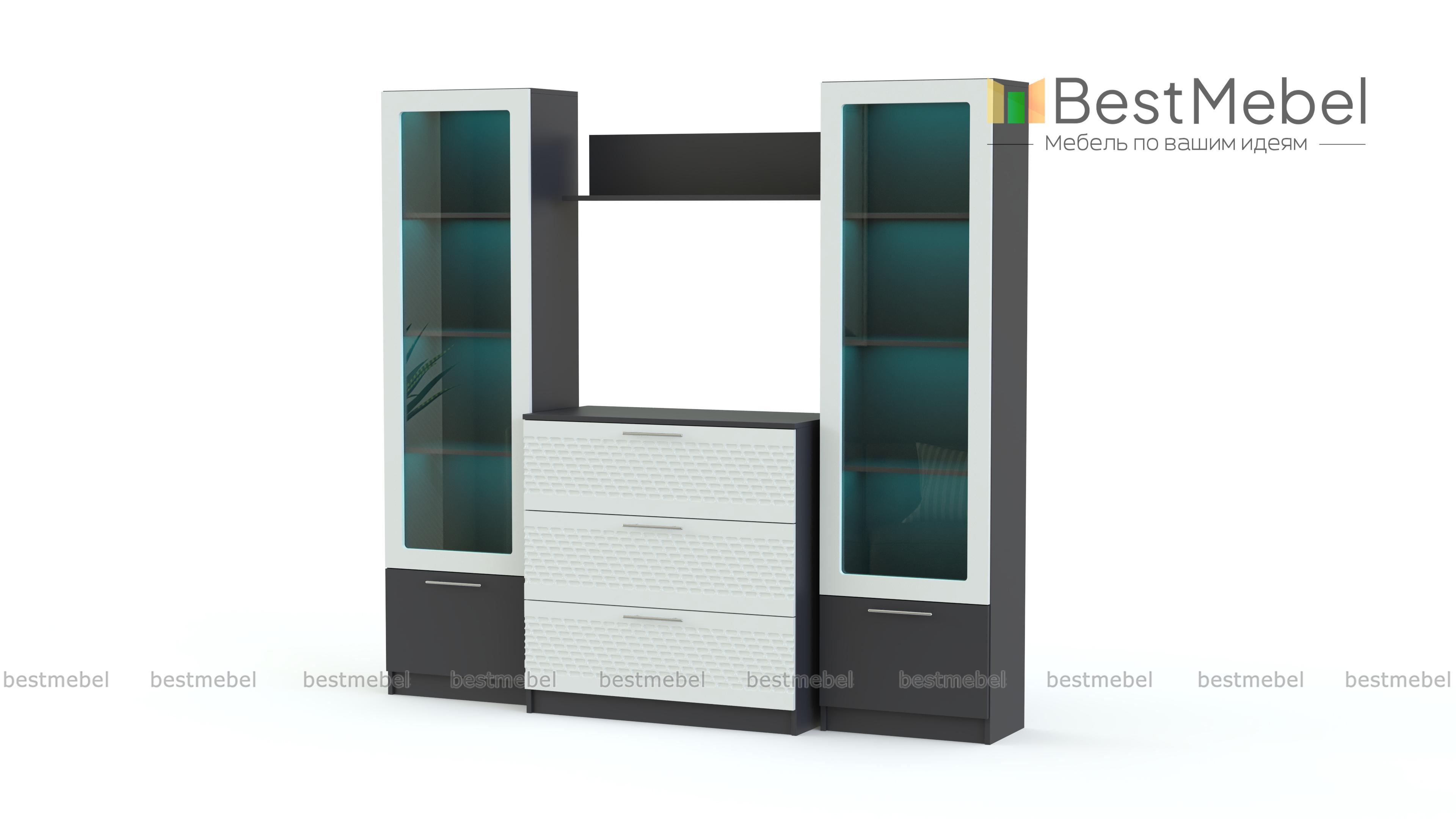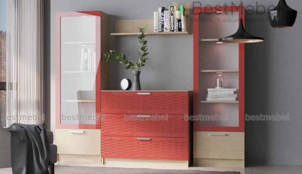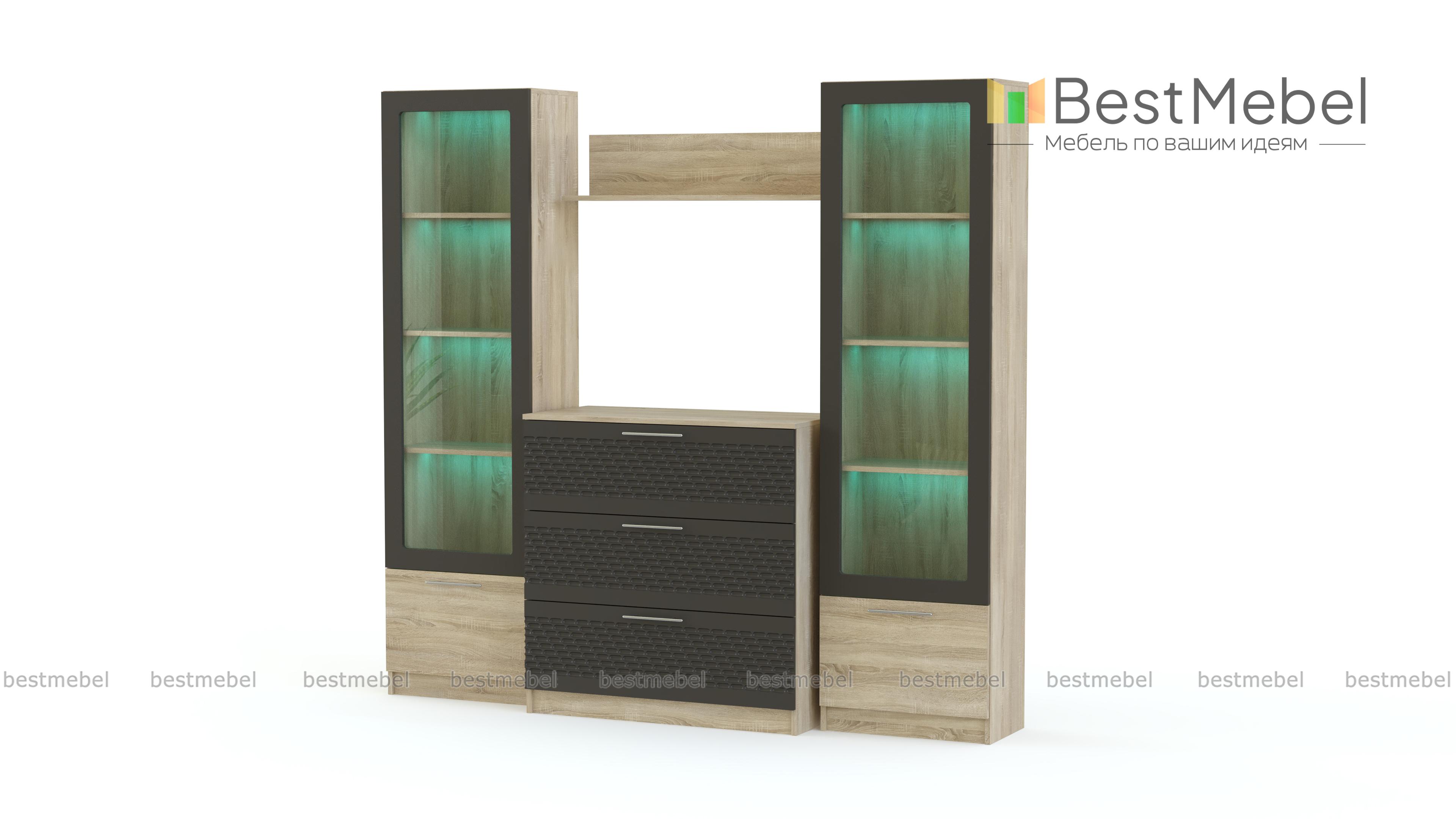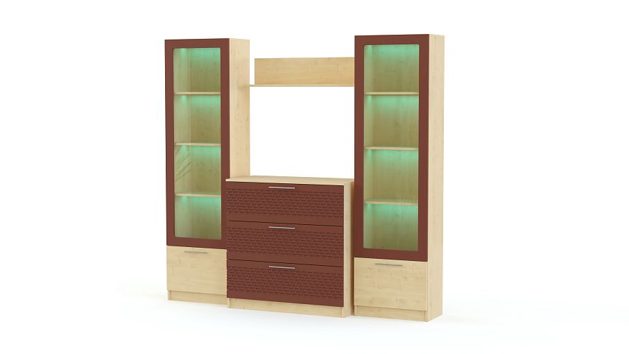 Стенка Блеск 40.1-3D BMS отличается практичной модульной конструкцией, универсальной для просторных и малогабаритных помещений. В комплекте вместительный комод с тремя выдвижными ящиками и две колонки с витринными секциями и глухими откидными дверцами в основании. Поклонники современных дизайнов оценят сочетание древесных тонов и матовых фасадов с рельефным рисунком. Купить стенку Блеск 40.1-3D BMS и обустроить комфортную зону отдыха вам поможет наш интернет-магазин.