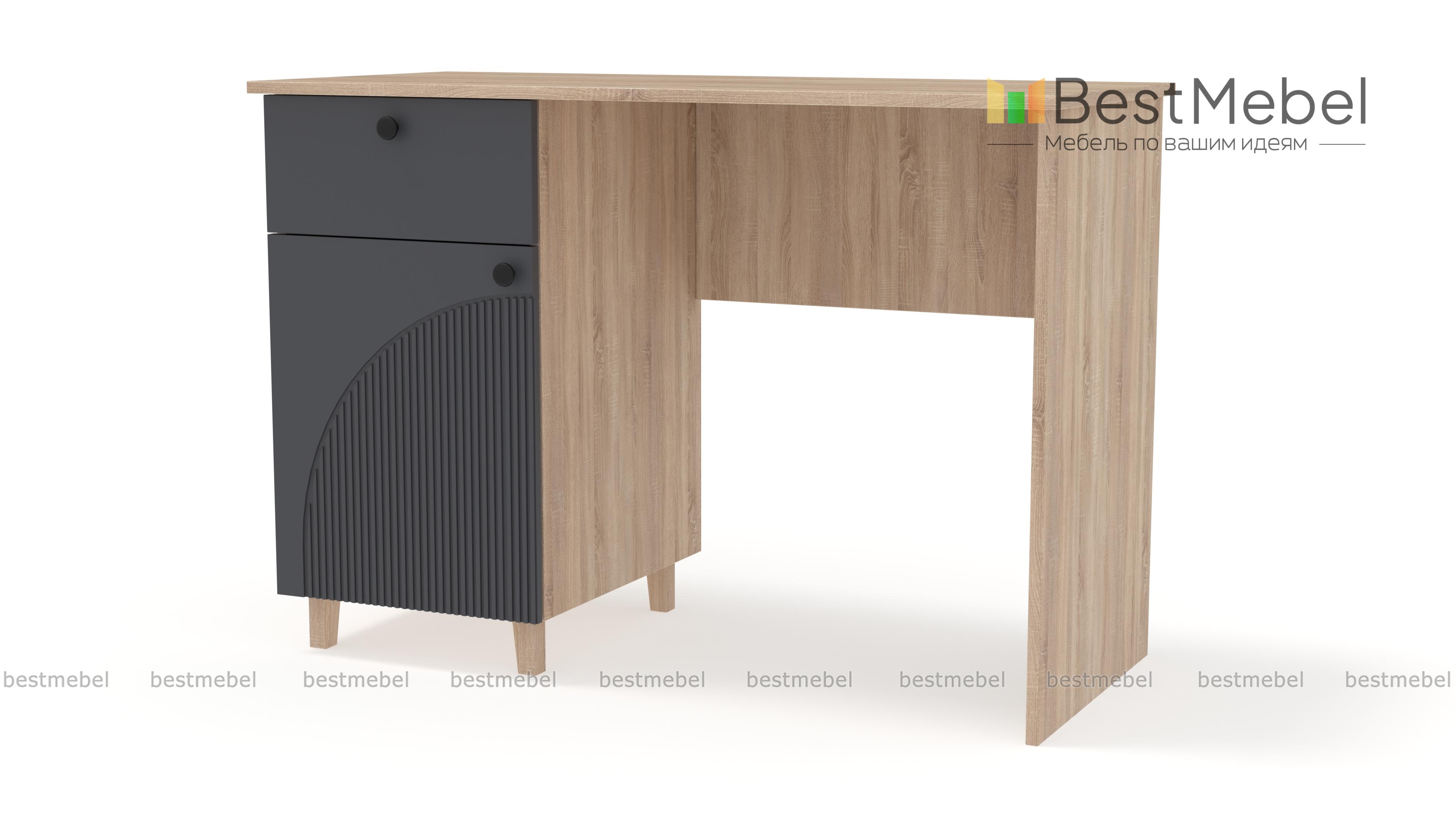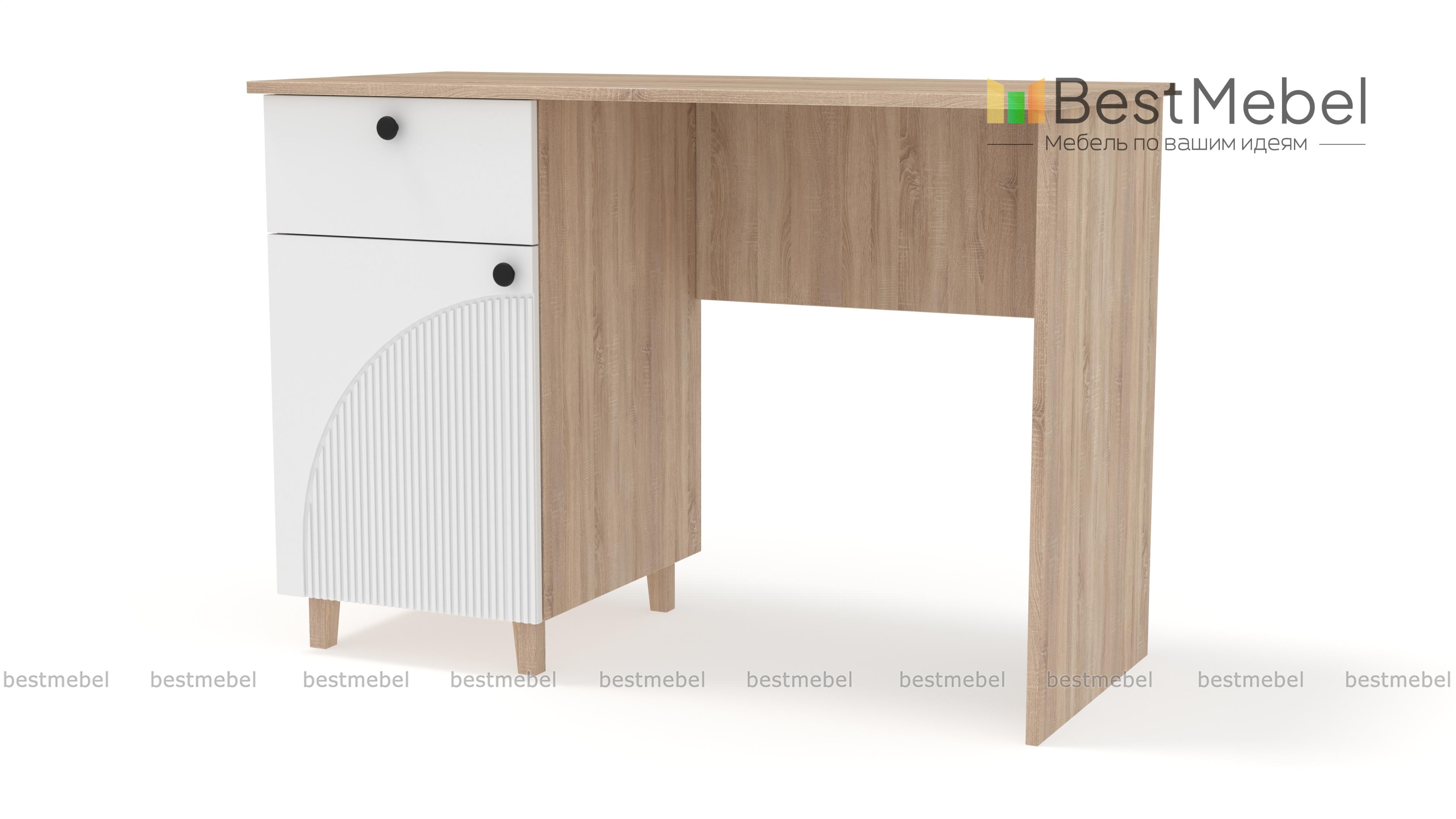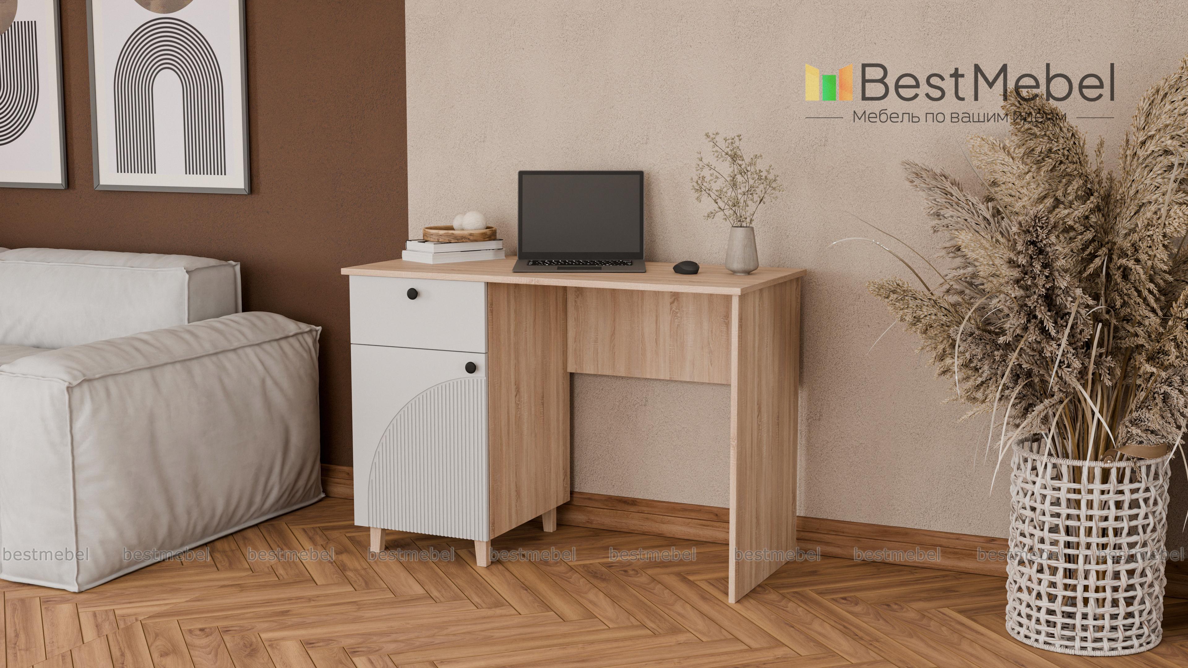 Стол письменный Вивьен 1 BMS поможет организовать комфортное и эстетичное рабочее место. Просторная столешница удобна для размещения компьютера и письменных принадлежностей, а для хранения канцелярских мелочей и бумаг предусмотрена тумба с выдвижным ящиком и дверцей. Прочный каркас из ЛДСП дополняет стильный рифленый фасад. Купить стол письменный Вивьен 1 BMS вы всегда сможете на сайте нашего интернет-магазина в нужном размере и любых оттенках из каталога.