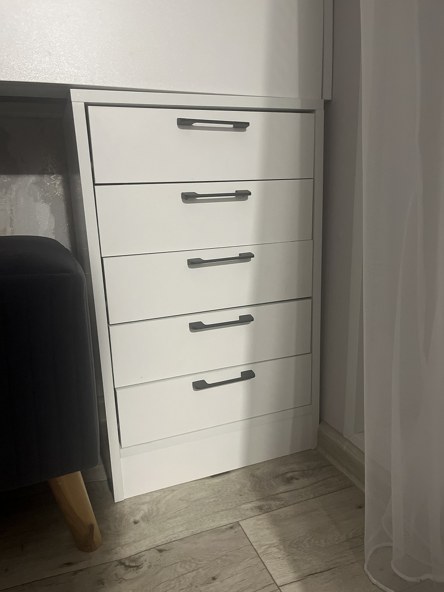 Заказ № 00000848580Комод классный, за свою цену вообще. Очень вместительный и удобный, направляющие шариковые хорошие, ящики выкатываются полностью, что тоже удобно. Ручки устанавливали сами, свои. Заказывала без ручек. Размеры комода немного меняли.