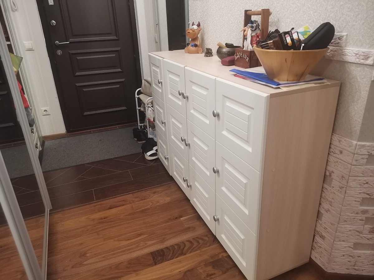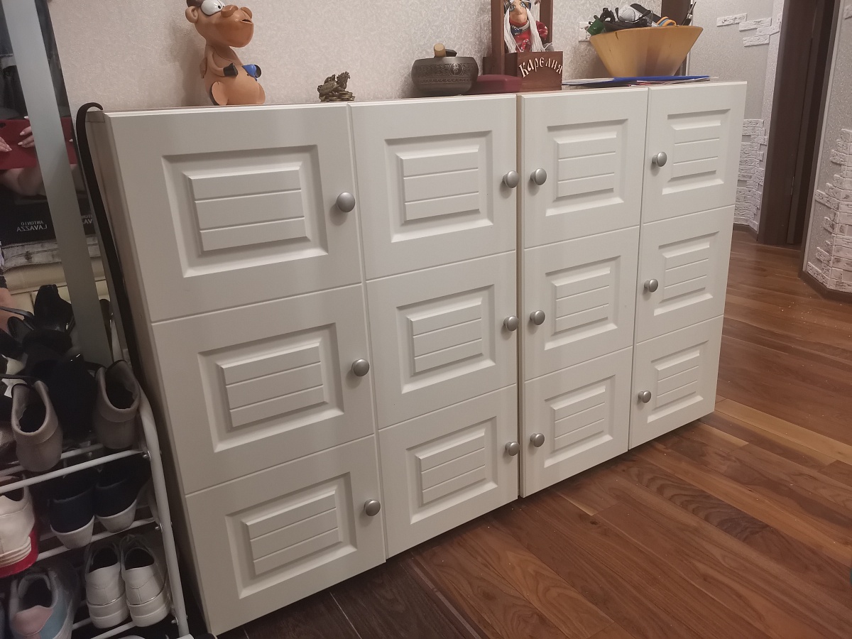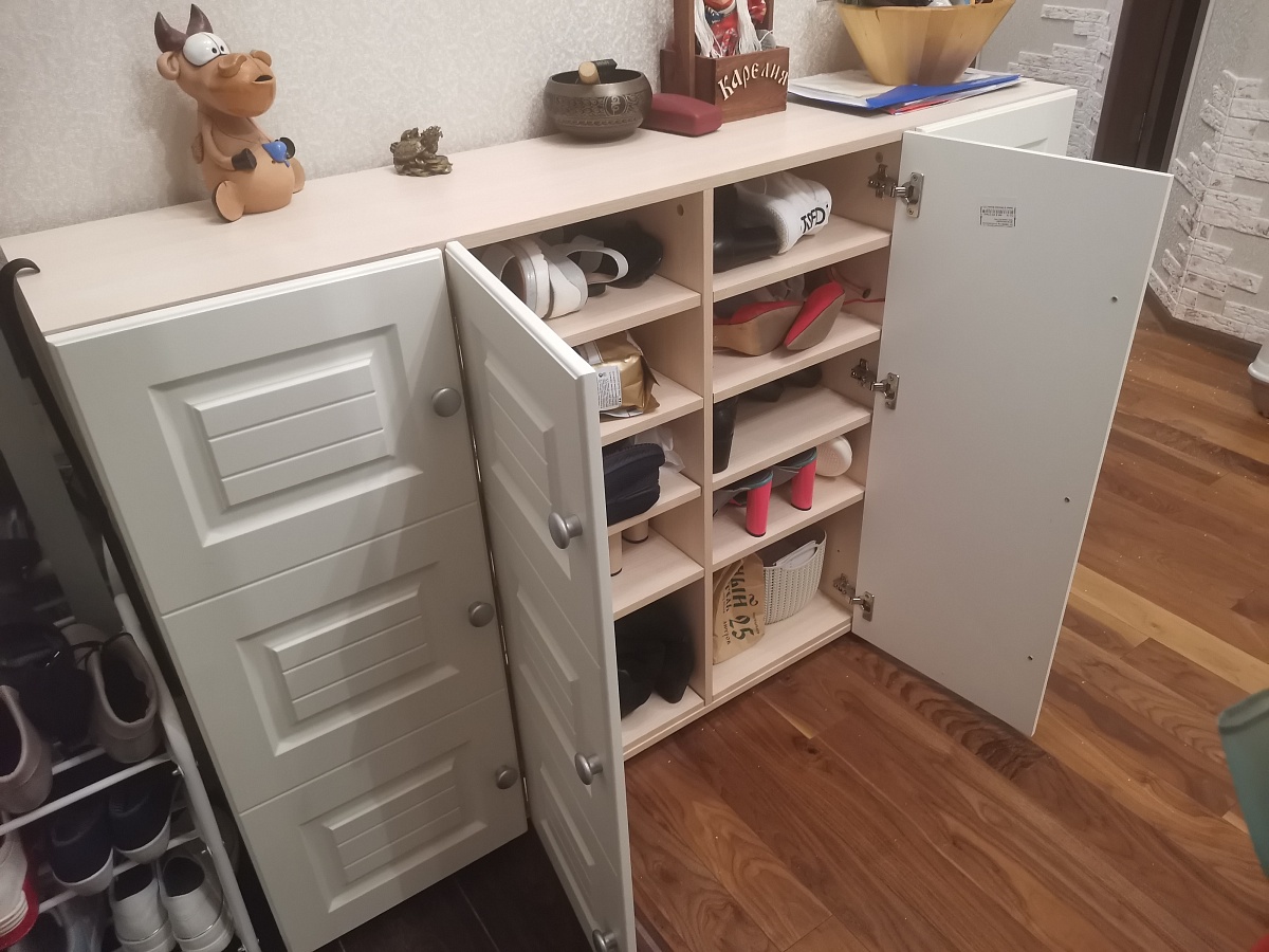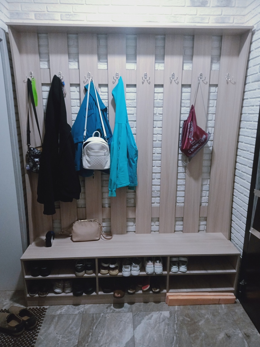 Заказ №10704. Прихожая шириной 1800мм, высотой 2200мм, имеет 8 двойных крючков для одежды и 6 отделений для обуви. Влезает примерно 18 пар обуви, съёмная полка добавляет трансформируемость прихожей - её можно при желании убрать и поставить высокие сапоги. Отлично вписалась в тесное пространство прихожей и позволила разгрузить от горы обуви вход в тамбур. - при монтаже надо быть аккуратным, так как могу образоваться нежелательные сколы на деталях.- из-за высоты, которая оказалось выше дверного проёма пришлось собирать отдельно верх и низ прихожей. Собирается легко - главное не спешить и внимательно изучить инструкцию. Детали подписаны это упрощает сборку.