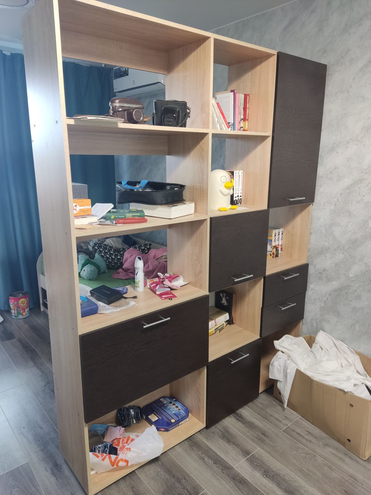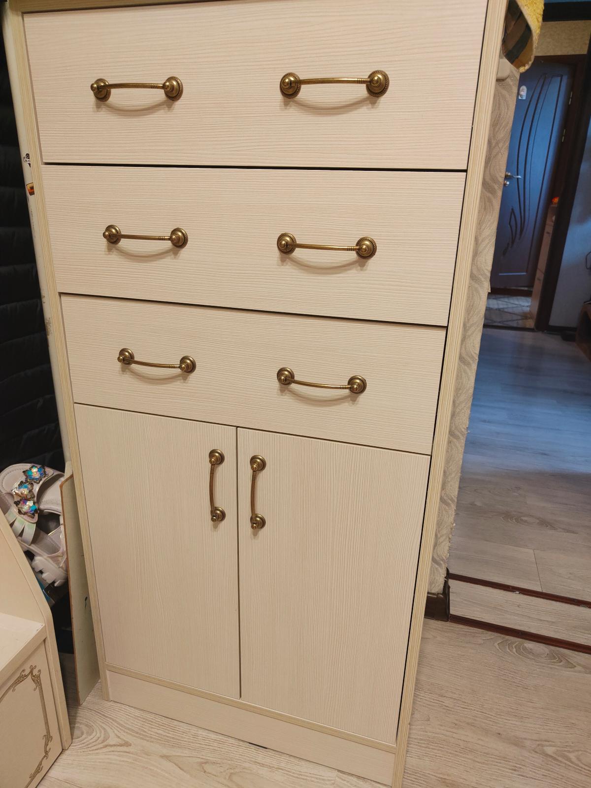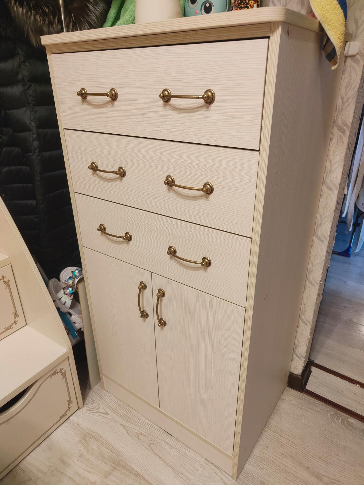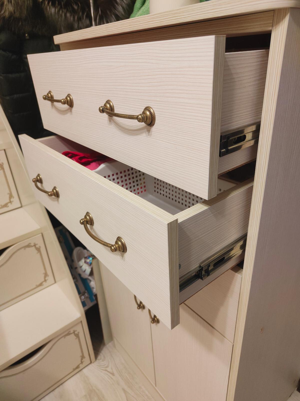 Отличный комод! Высокий сделали, что бы все вещи, которые нужно быстро достать, поместились. Удобно, что есть и выдвижные ящики и большой отсек за дверцами. Очень понравилось, что можно внести пожелания. Я поставила Скругление углов, чтобы не биться об него. Доставили быстро.