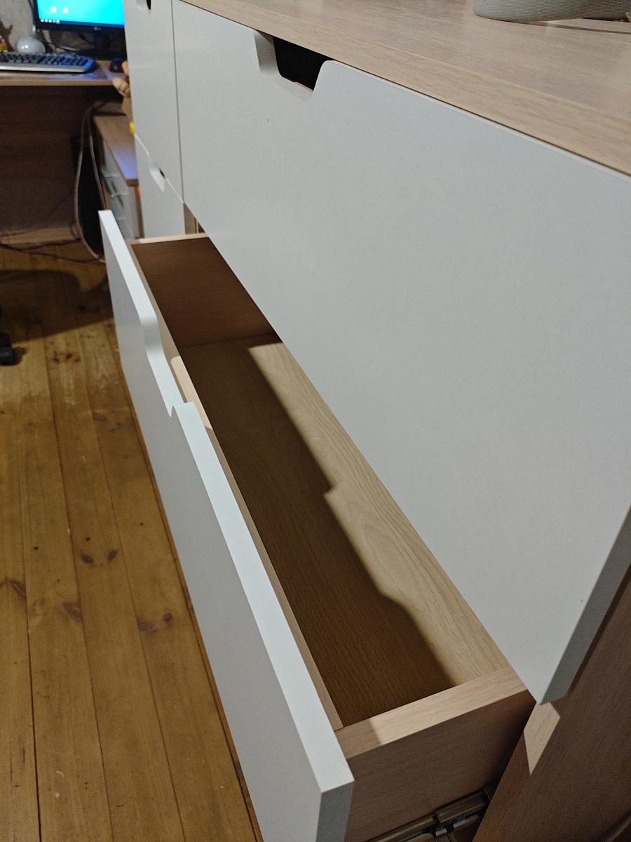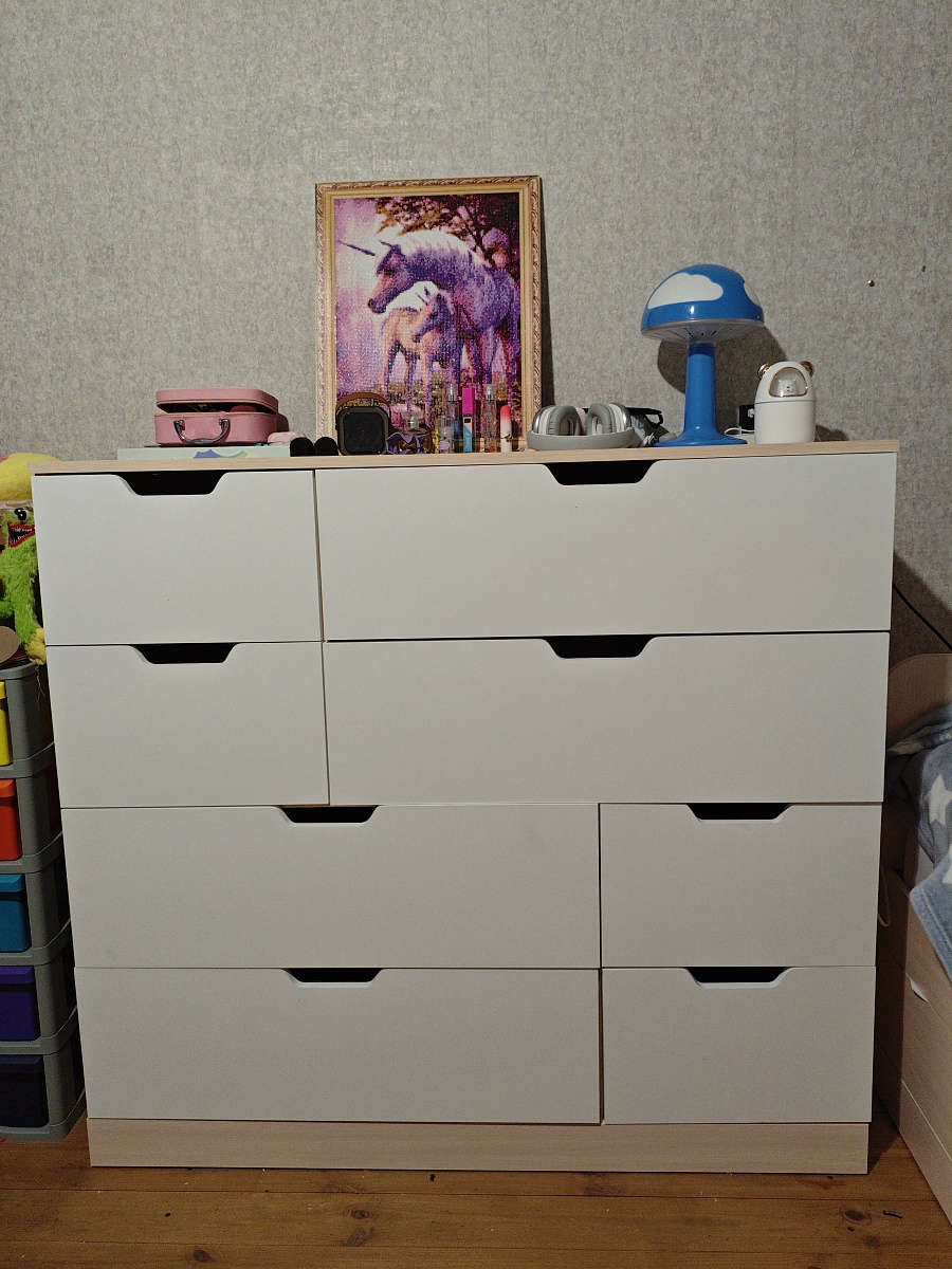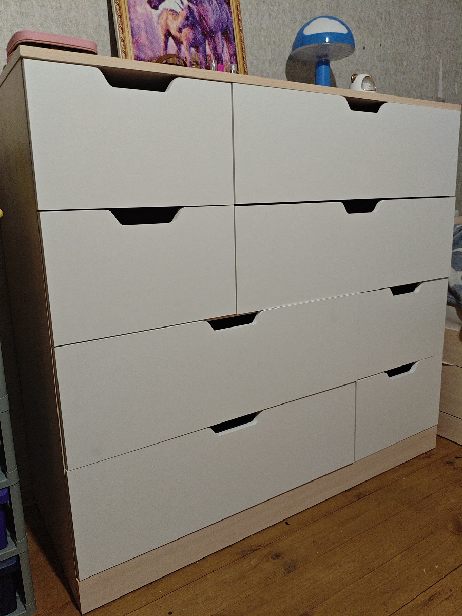 Отличный комод: вместительеый, удобный, красивого дизайна. Сборка немного напрягла: муж немного запутался в досках (инструкция непонятная, надо последовательные шаги указать, а не картинку в разрезе. Но самое загадочное - отсутствие дыр для ручек на откидной крышке. Пришлось высверливать для болтов. Затратно по времени вышло.