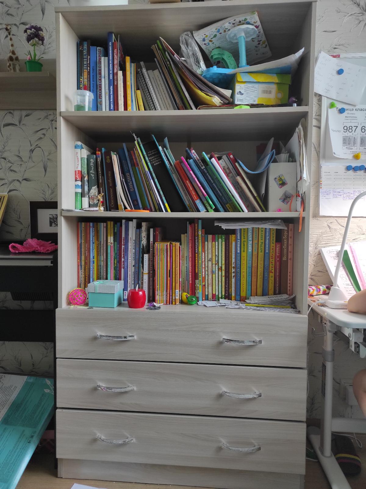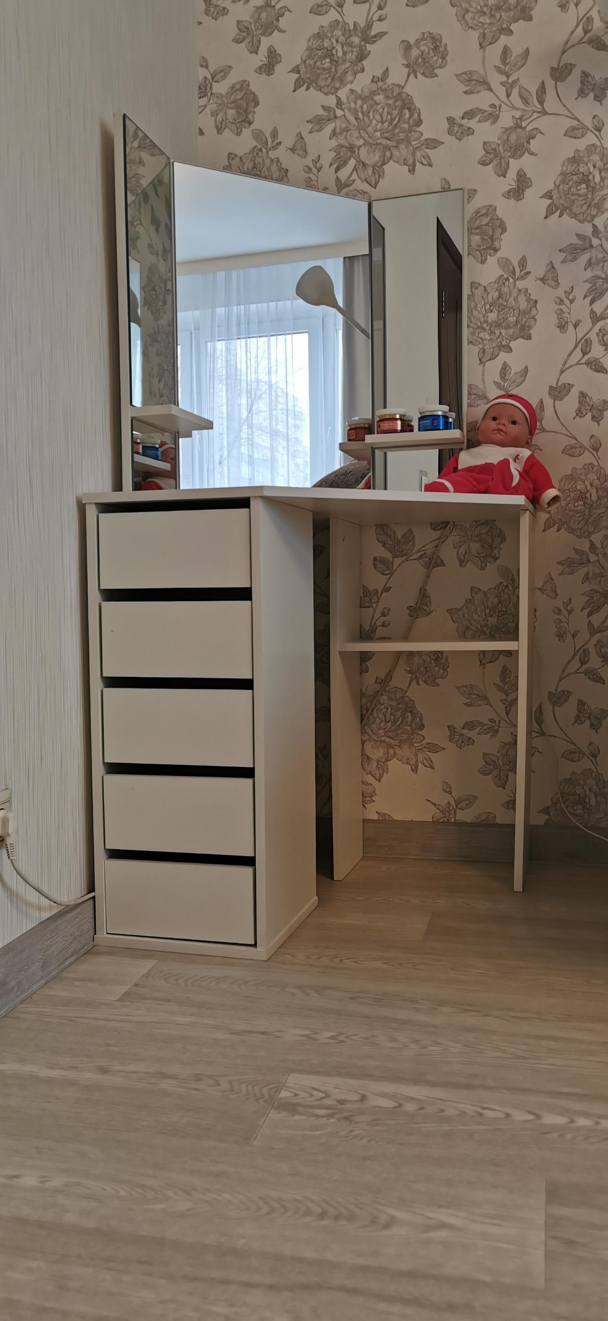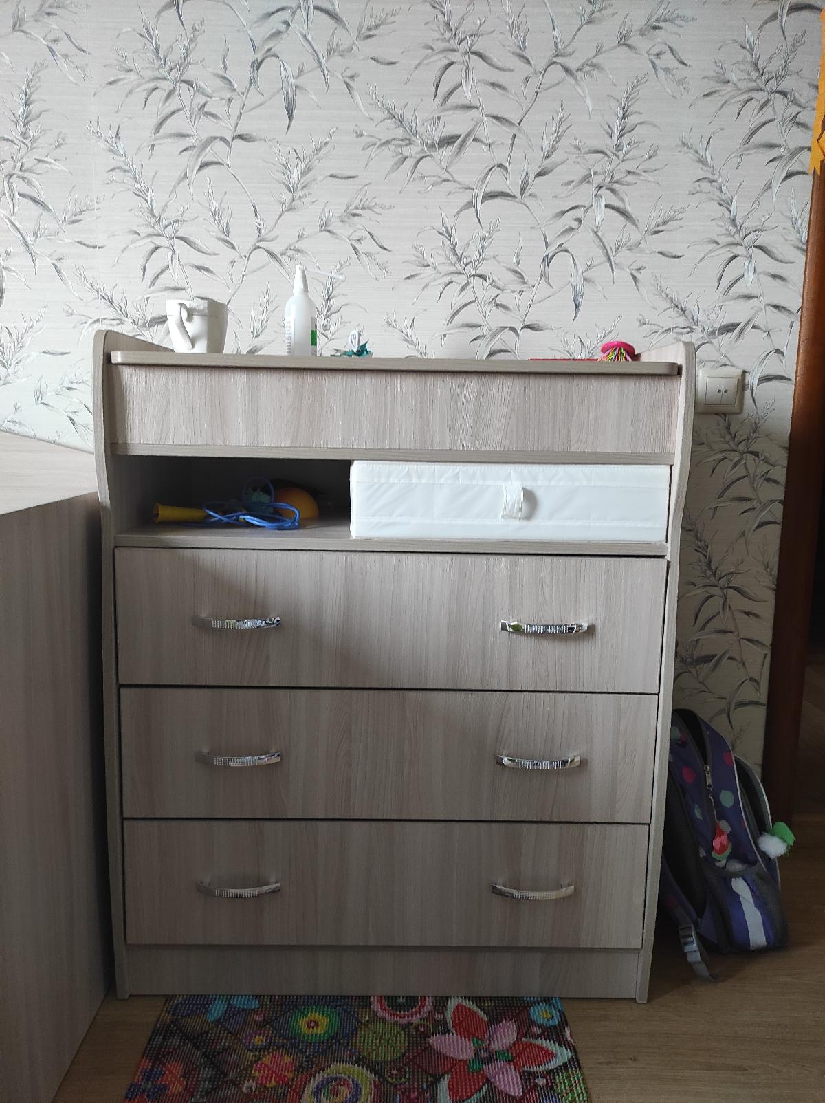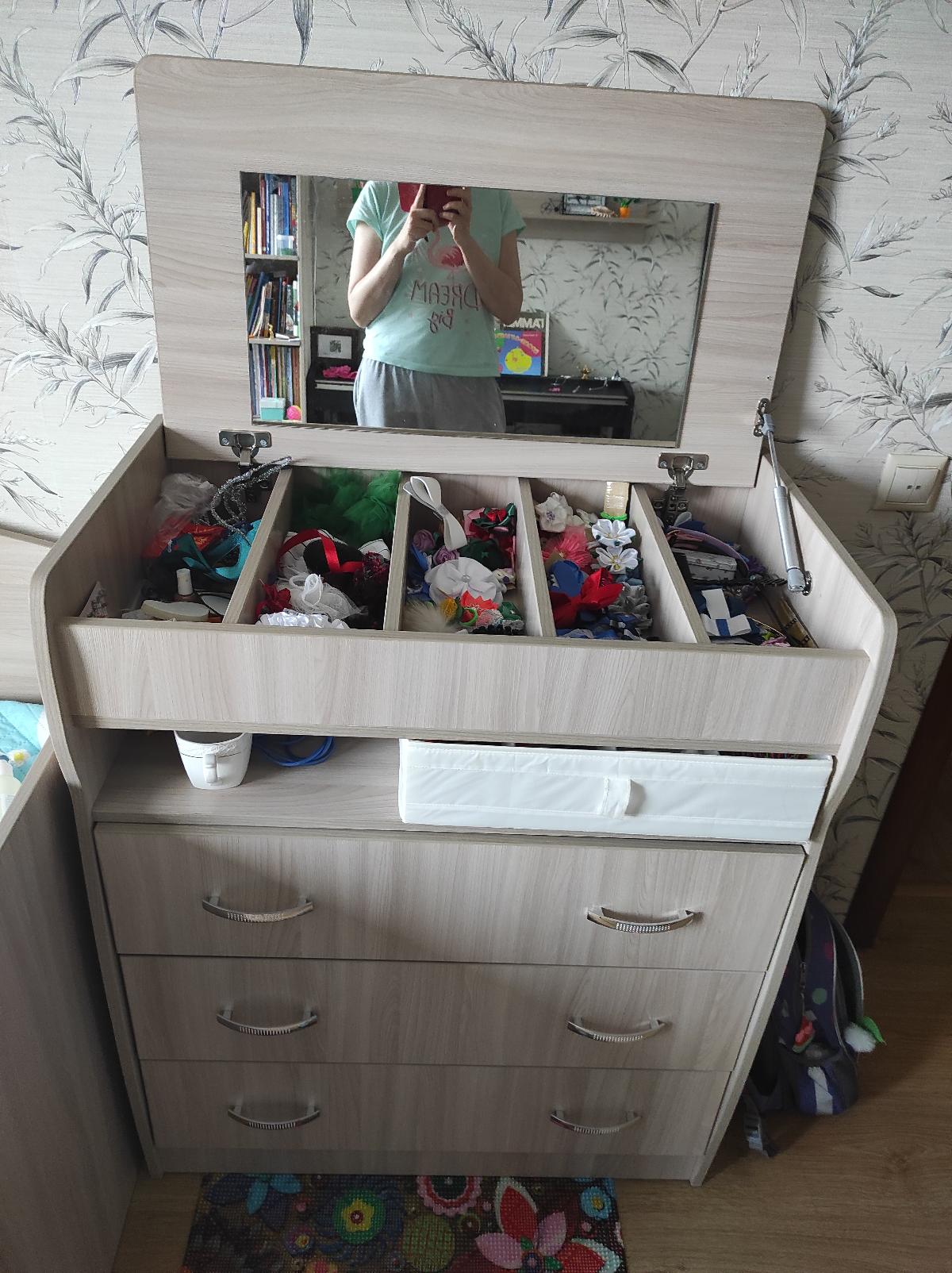 Комод брала в детскую, для девочки, в основном, из-за подъёмной крышки с зеркалом и отделениями для резинок, заколок, украшений и прочих девчачьих радостей. Цвет ясень Шимо светлый, кромку лучше 2 мм брать, выглядит лучше и ребёнку безопаснее, не поцарапается. Направляющие лучше шариковые, удобные, проблем нету, задвигаются ящики хорошо. Внутреннее углубление ( под верхней полкой) на мой взгляд, бесполезное и не удобное, ребёнок запихивает туда всё что захочет, и там вечный бардак. Уж лучше было бы ещё один ящик запилить, или эти углубить. Дно в ящиках крепкое, мне понравилось. В эксплуатации 3 года, ничего не поломалось.