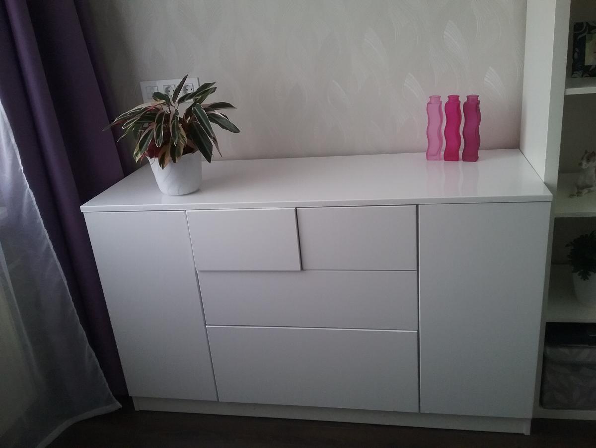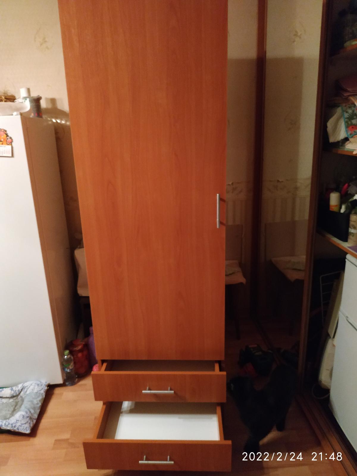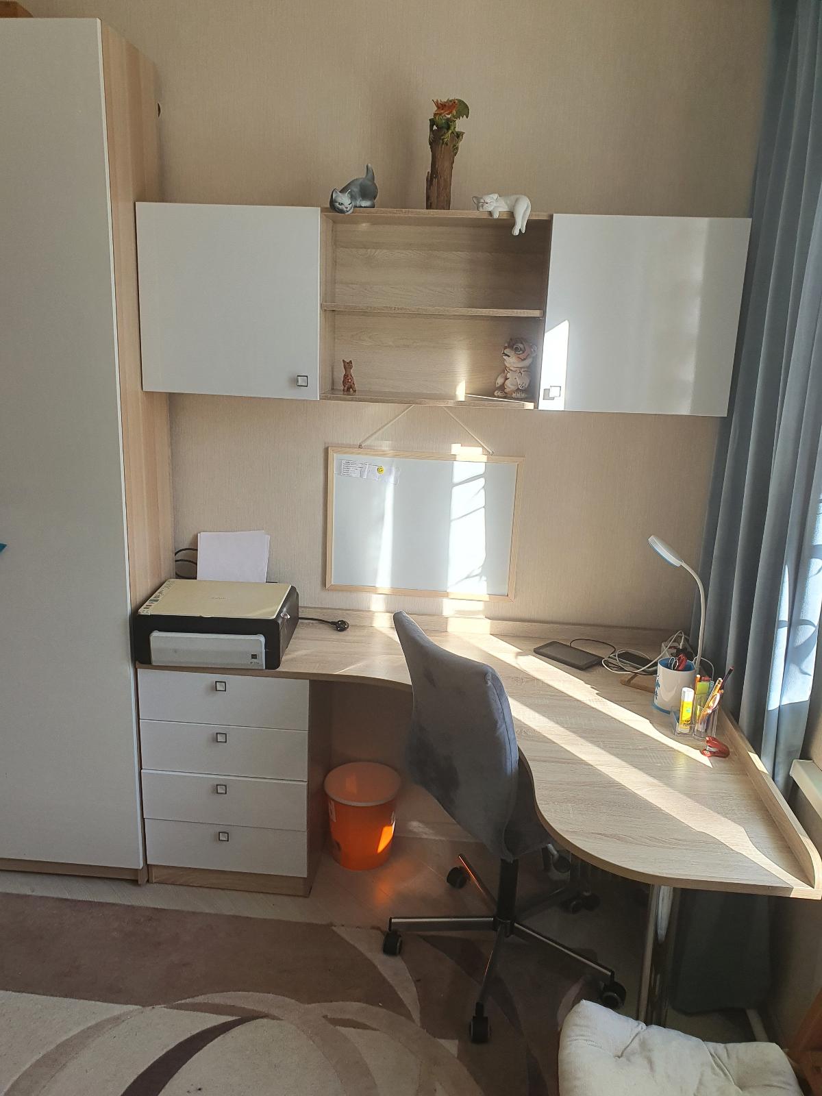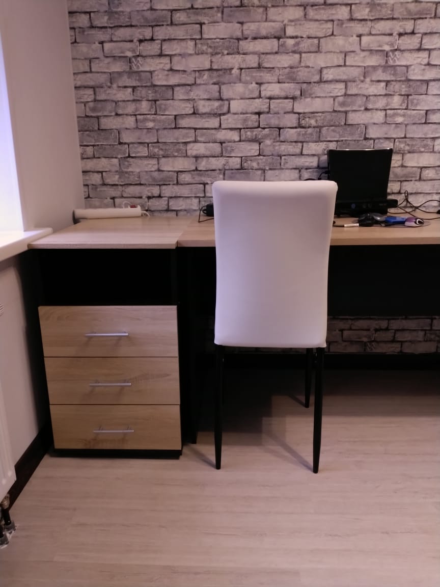 Заказывали стол по индивидуальному эскизу и полку над столом. Столешница утолщенная, радиусы сделаны отлично, качеством довольны. Сколов не было, фасады в защитной пленке. Сделали очень быстро, от момента заказа до доставки ровно неделя. Цвет корпуса дуб сомона, фасады белый глянец, рядом шкаф из икеи, цвет корпуса почти совпал, немного другая текстура, но практически не заметно. Собирали сами, сборка не сложная, не хватало нескольких отверстий для скрепления, муж решил вопрос с помощью дрели. Цена, качество и сервис оставили очень приятное впечатление. Спасибо