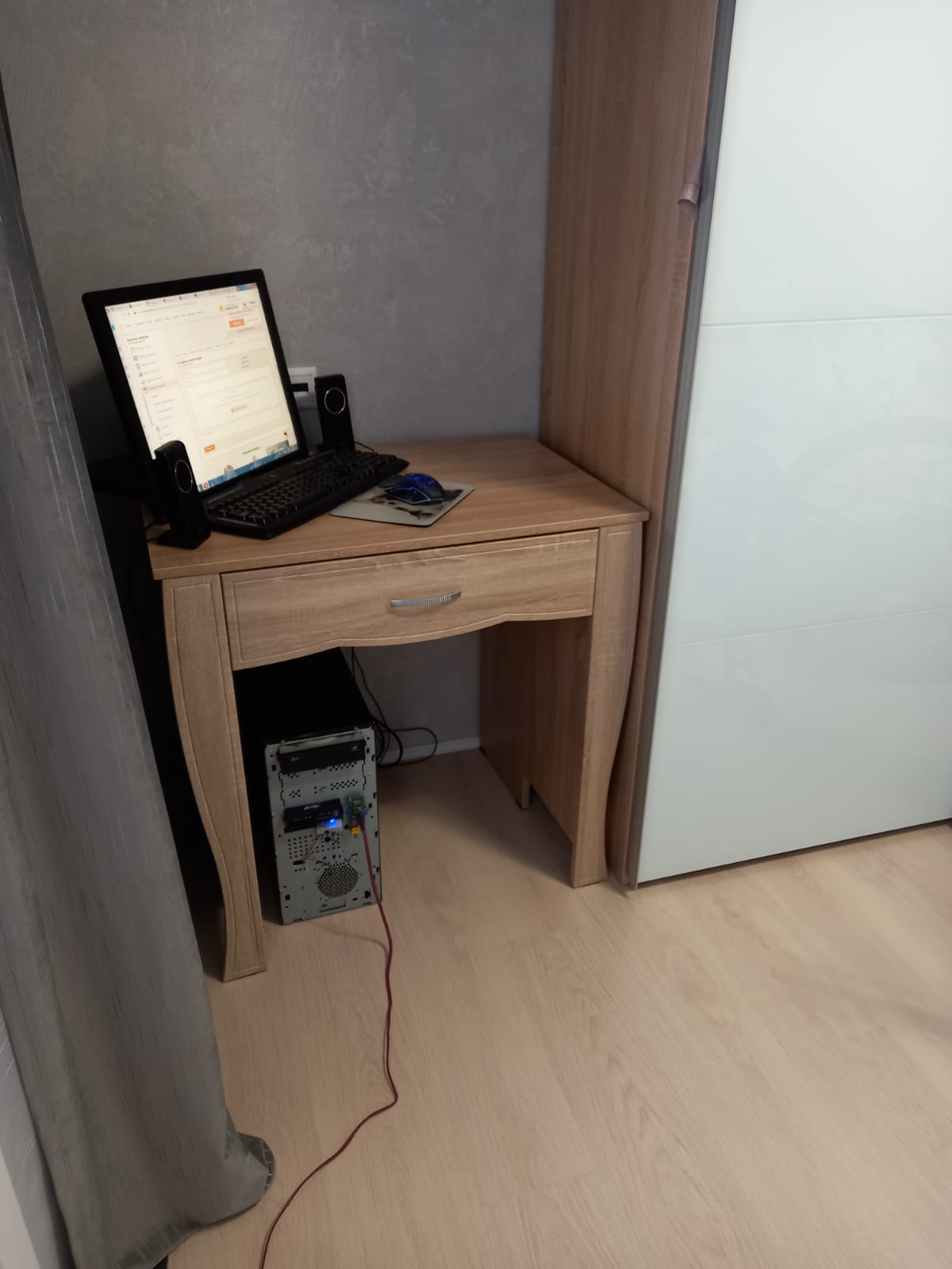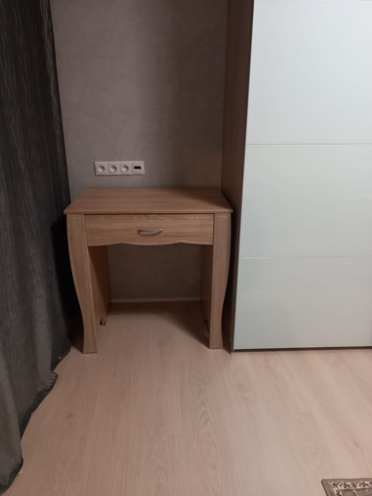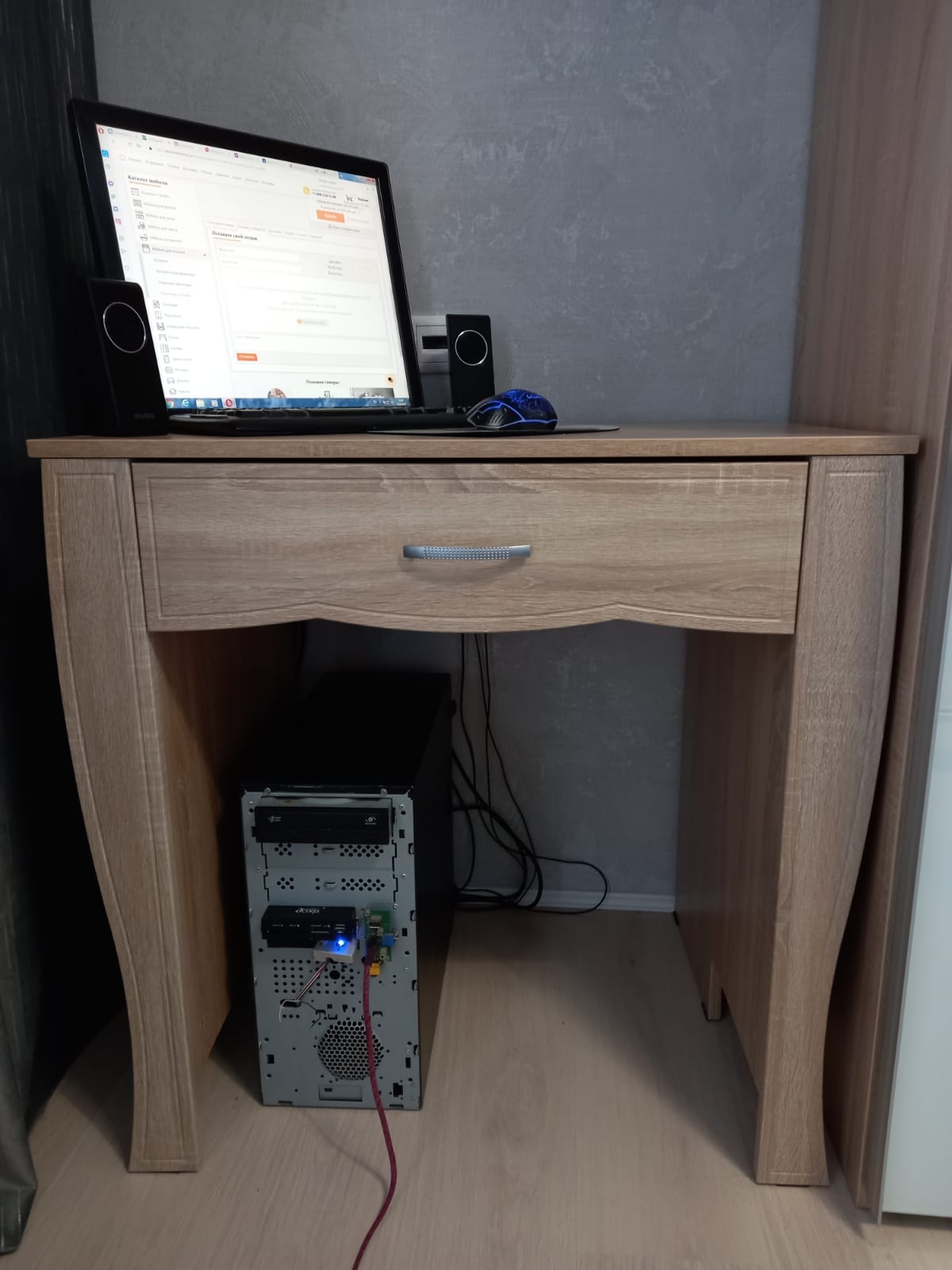 Заказывали стол по индивидуальному эскизу и полку над столом. Столешница утолщенная, радиусы сделаны отлично, качеством довольны. Сколов не было, фасады в защитной пленке. Сделали очень быстро, от момента заказа до доставки ровно неделя. Цвет корпуса дуб сомона, фасады белый глянец, рядом шкаф из икеи, цвет корпуса почти совпал, немного другая текстура, но практически не заметно. Собирали сами, сборка не сложная, не хватало нескольких отверстий для скрепления, муж решил вопрос с помощью дрели. Цена, качество и сервис оставили очень приятное впечатление. Спасибо