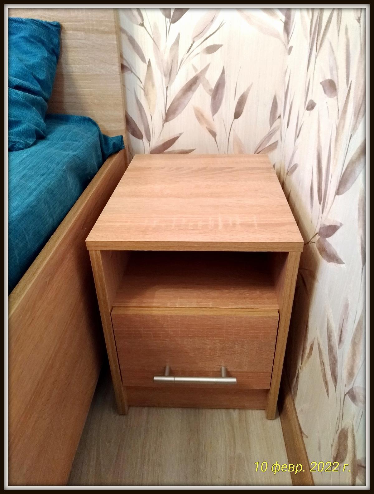 Заказали тумбочку, при заказе меняла цвет и размеры - очень радуют эти опции!!! Привезли через день! Но - оказалось, что обе боковые стенки - правые. Связалась с магазином, в течение недели проблему решили, довезли левую стенку. Но - она оказалась светлее на пару тонов остальных деталей. В процессе сборки обнаружилось, что некоторые отверстия просверлены неправильно. Не стали уже ничего писать/возвращать, ибо - это не критично, всё равно, видно не будет. Кстати, на фото видно, что ручка ящика низко, должна быть выше, именно из-за того, что неправильно просверлены отверстия. Но, в целом - качество хорошее, поэтому поставила везде 5 звёзд. Очень нравится магазин и возможность замены цвета и размеров.