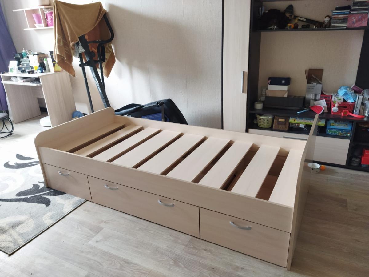 Заказ №478493. Купила сыну-подростку. Вообще отличная кровать, ничего лишнего. Три вместительных ящика, низкое изножье, никаких лишних элементов, хорошо вписалась в интерьер и значительно экономит место (до этого был диван). Из минусов - не доложили фурнитуры (саморезов), хорошо, что у собиравшего человека оказался запас.