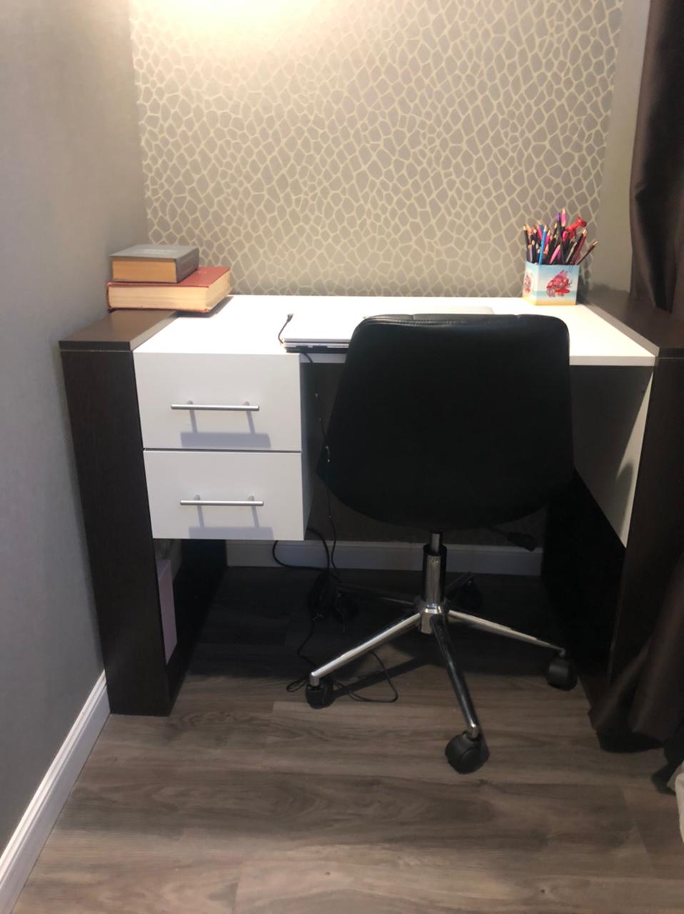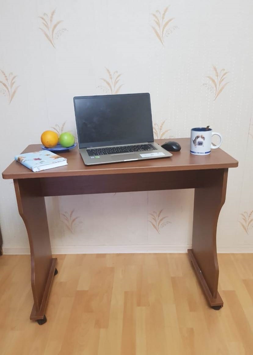 На Новый год сделали себе подарок - заказали этот столик. Удобно, что здесь на сайте можно смоделировать свой, индивидуальный столик, подходящий тебе по цвету и размерам. Решили сделать чуть подлиннее, чем стандартный. Теперь на нем можно одновременно и поработать, и чай попить - места предостаточно. А вечером легким движением руки столик на своих колесиках отправляется спать к стенке. Кстати, очень долго искали такую небольшую модель на колесиках и нигде не могли найти. Спасибо за быстрое и качественное изготовление! Заказ 00000576651, изделие Стол компьютерный Костер 1 BMS (900х750х450).