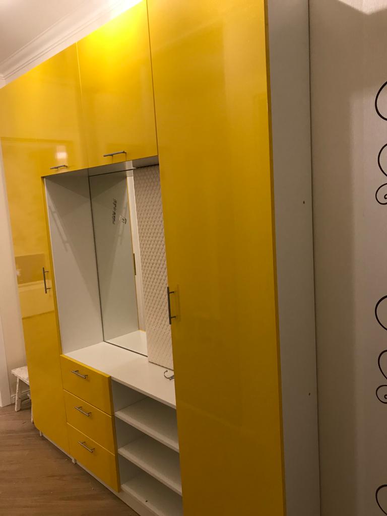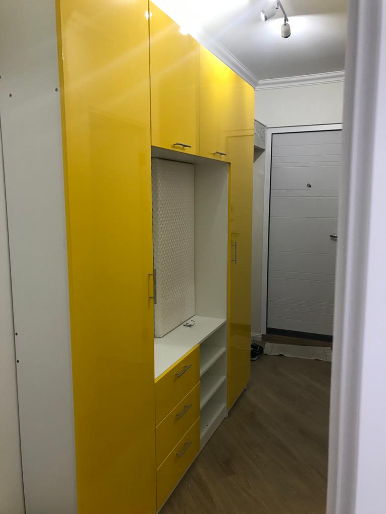 В целом отличная прихожая, только одна деталь меня в ней удивила. Это панель где крючки. Кто ее додумался такой толщины делать я не знаю, и становится она совсем не функциональна. Такая толщина подходит для сидения, но не как ни для вешалки. Лучше бы оставили ЛДСП обычное, а на нем крючки, знала бы что такое будет, внесла бы изменения в заказ.  Крючки желтые я покупала сама, в заказе эконом вариант не подходящий по стилю, но это не напрягает совсем. Желтый глянец в маленькой прихожей смотрится очень хорошо. По качеству претензий нет.