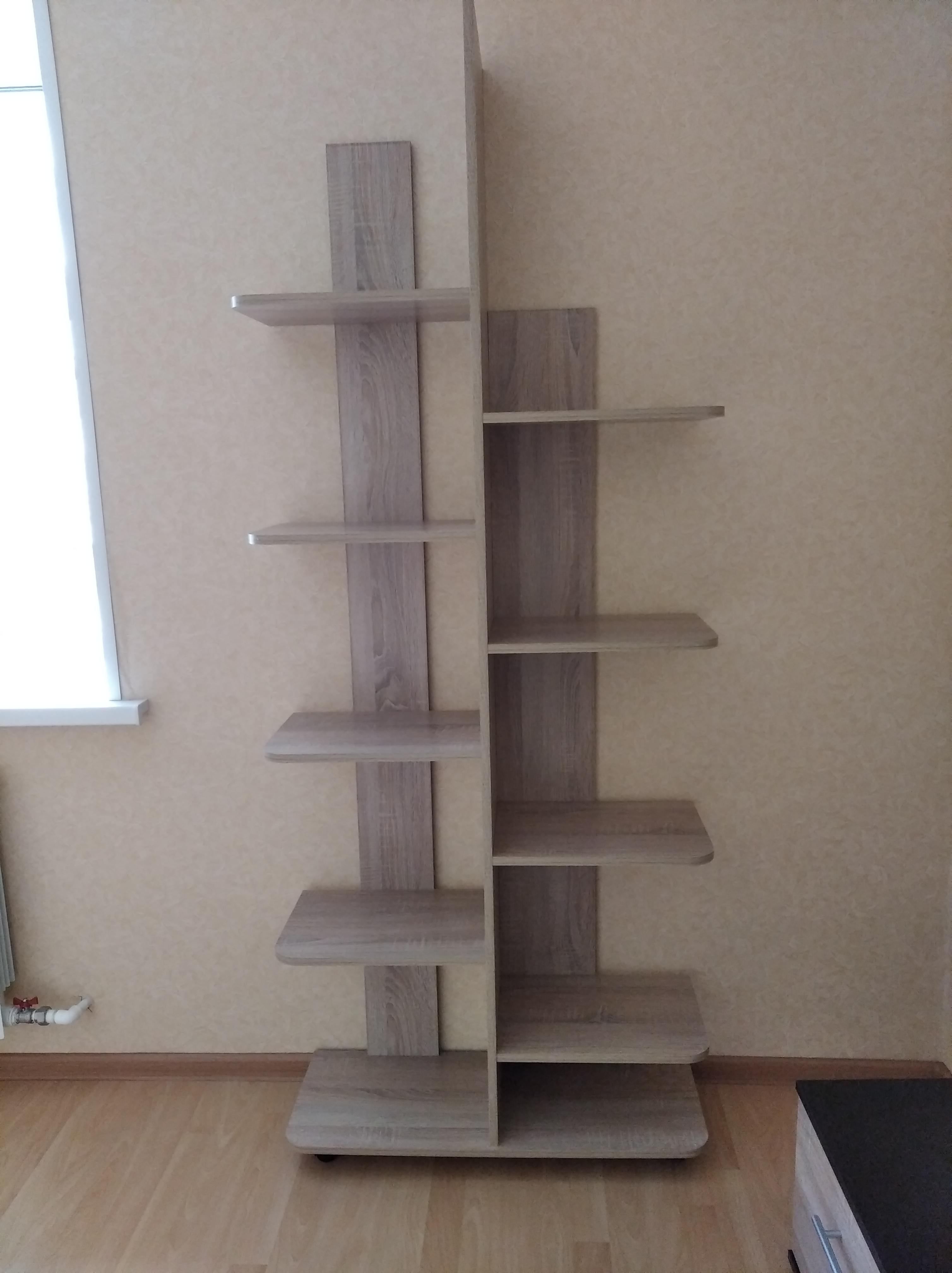 Стеллаж очень понравился, выглядит стильно. Выполнен качественно, Единственный минус - не очень устойчивый, если не крепить к стене. Лучше были бы ножки, а не колеса.